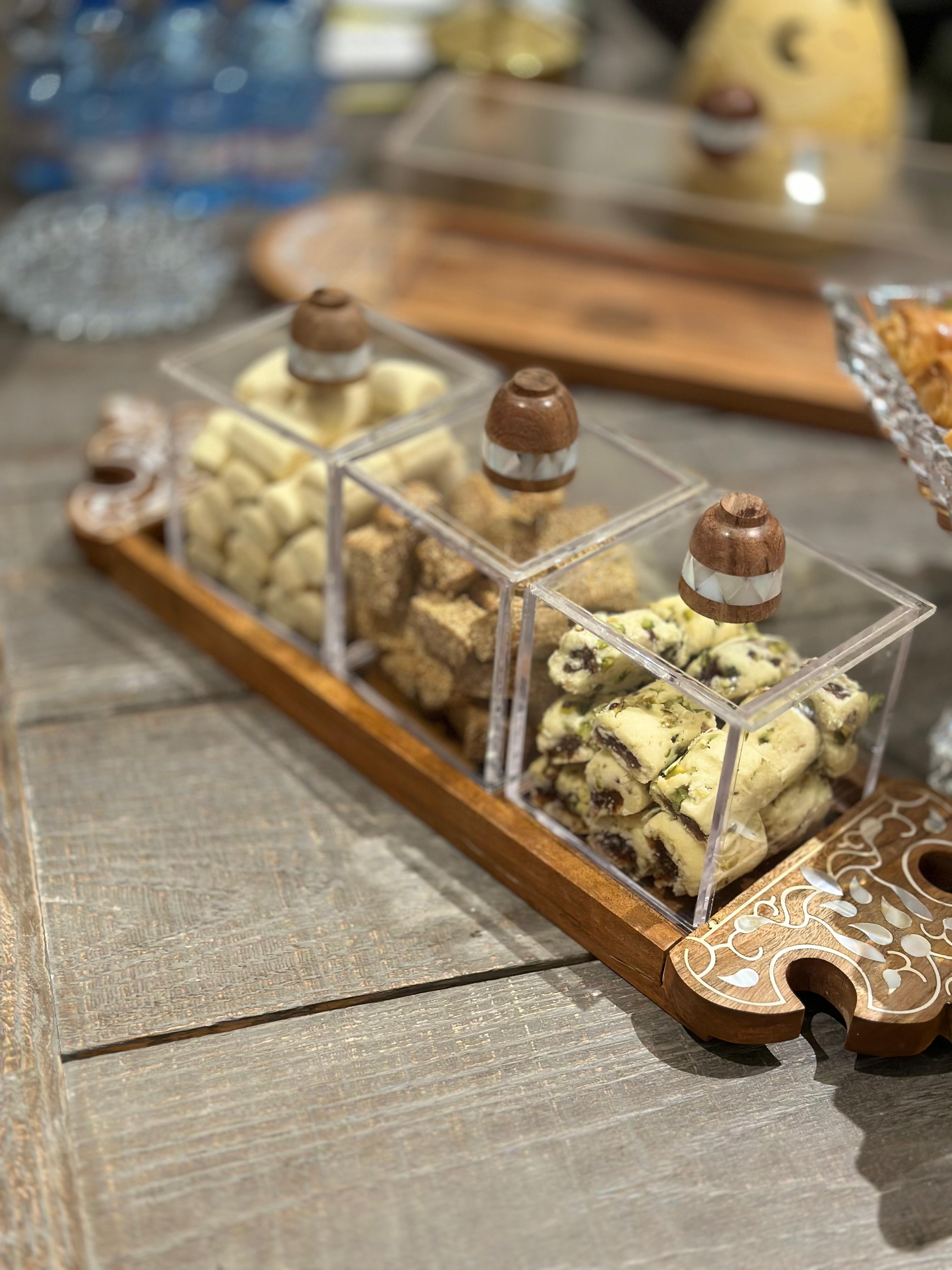 Introducing our exquisite wood tray featuring a stunning mother of pearl floral design. Complete with three acrylic containers for storing your favourite snacks like dates, nuts, chocolates and trats . Ideal addition to your coffee table and gatherings.