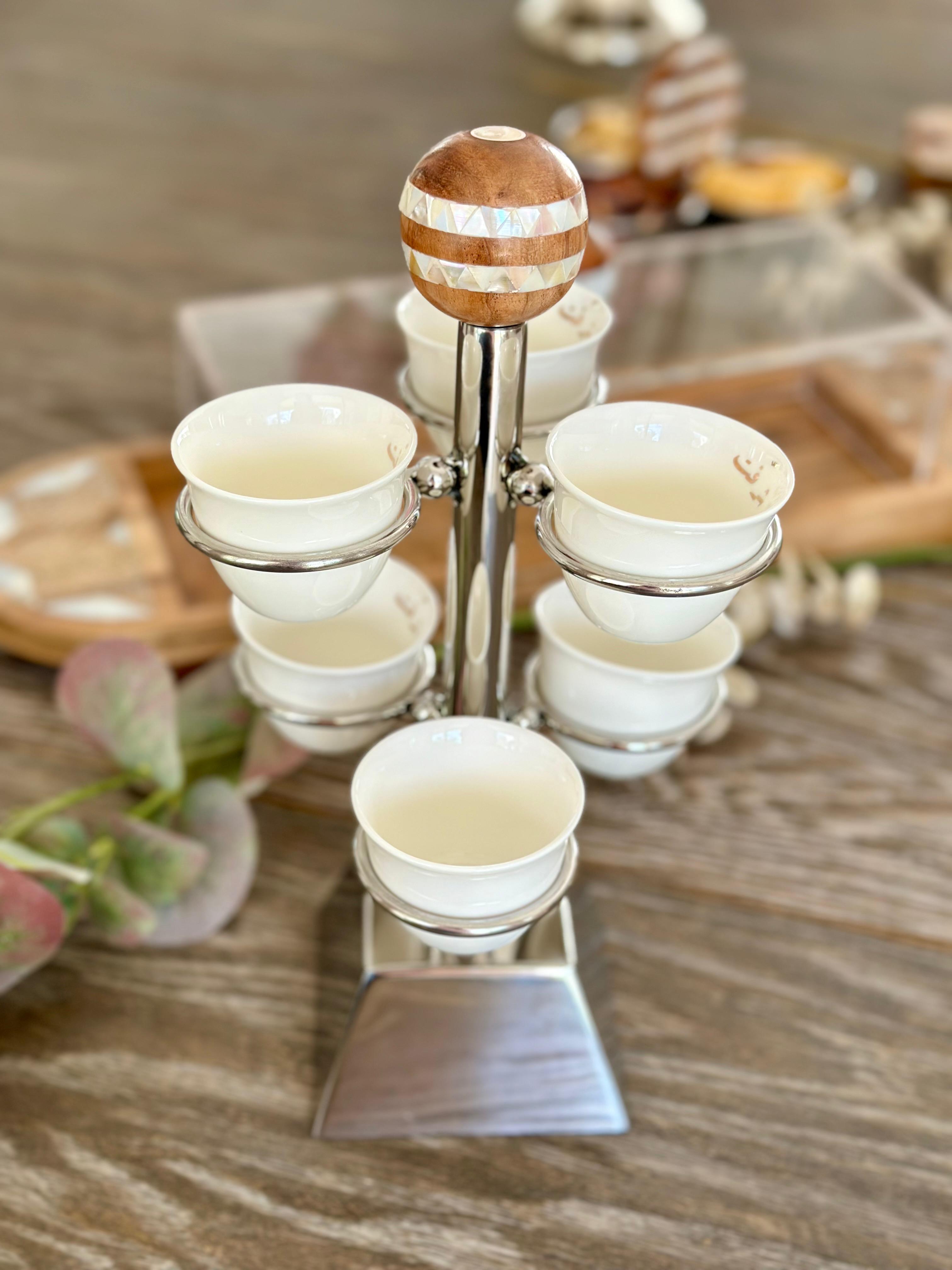 Our exquisite stainless stell coffee cup stand featuring mother of pearl and wood handle . This stand accomodates up to 6 coffee cups. A flawliss design that transcends trends. This piece is a classic addition to any home.