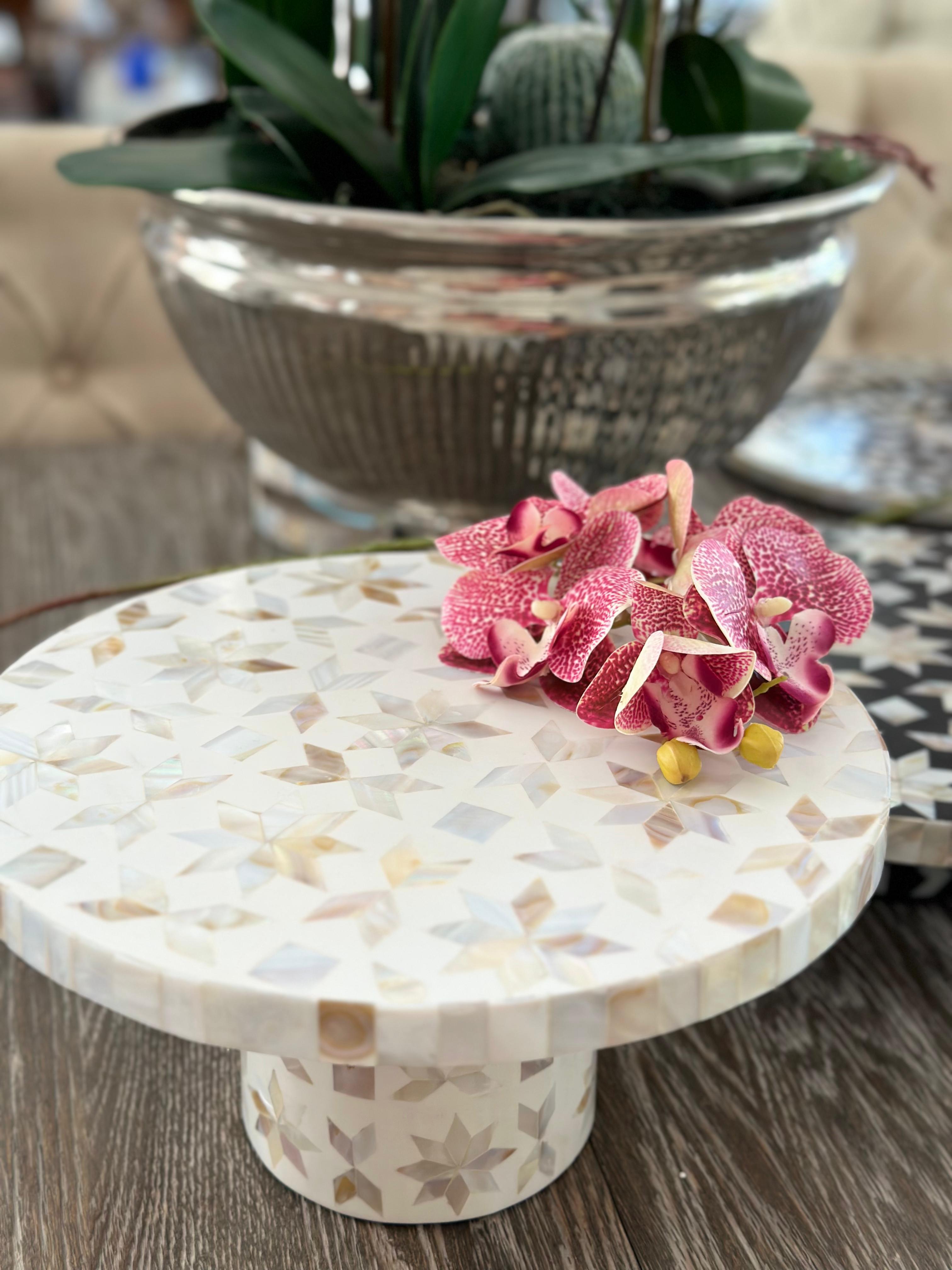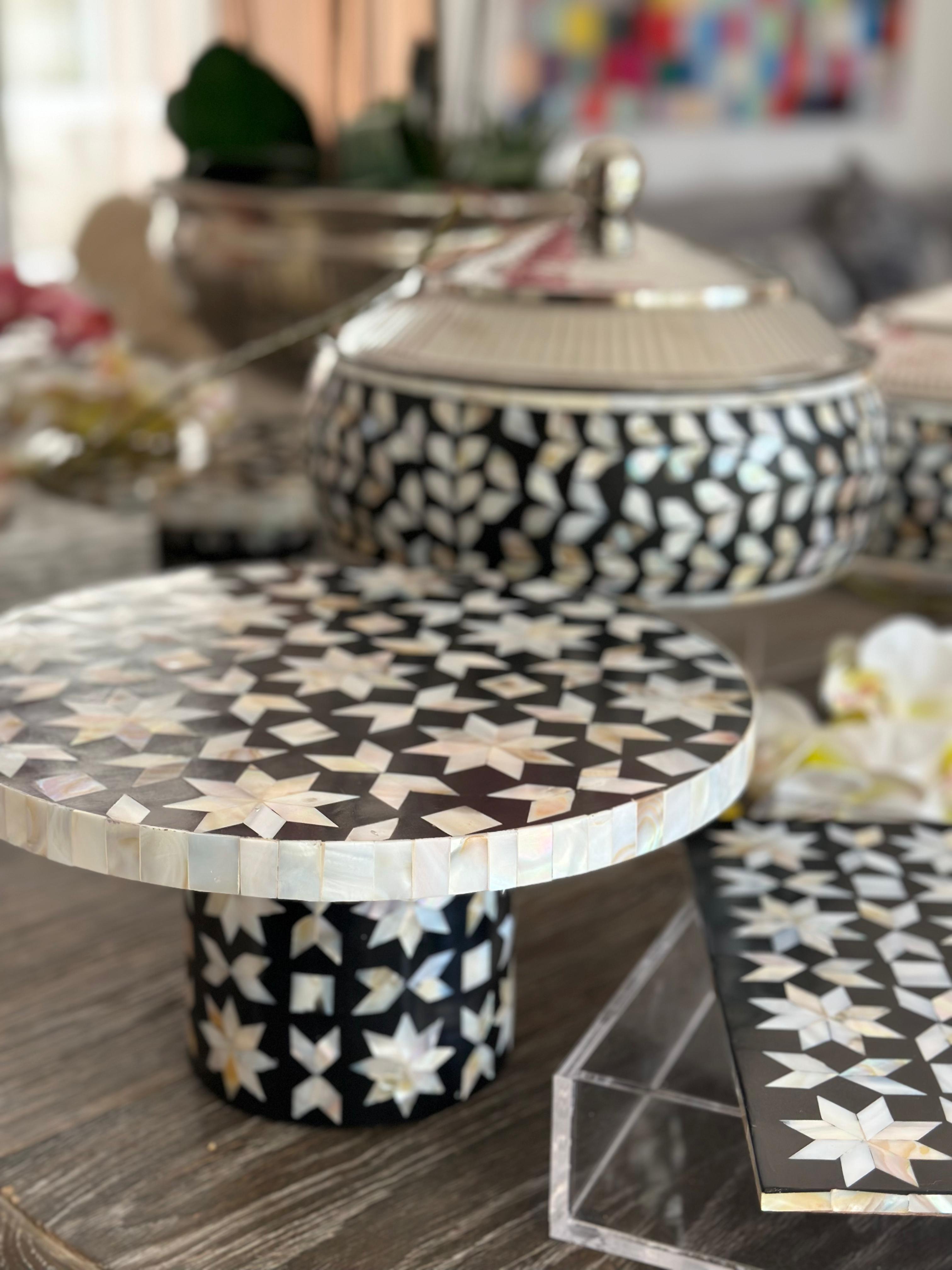 Introducing our exclusive square cake stand featuring a stunning mother of pearl inlay design, meticulously handcrafted by our skilled artisans. This piece seamlessly blends classic elegance with modern touch for a sophisticated appearance.