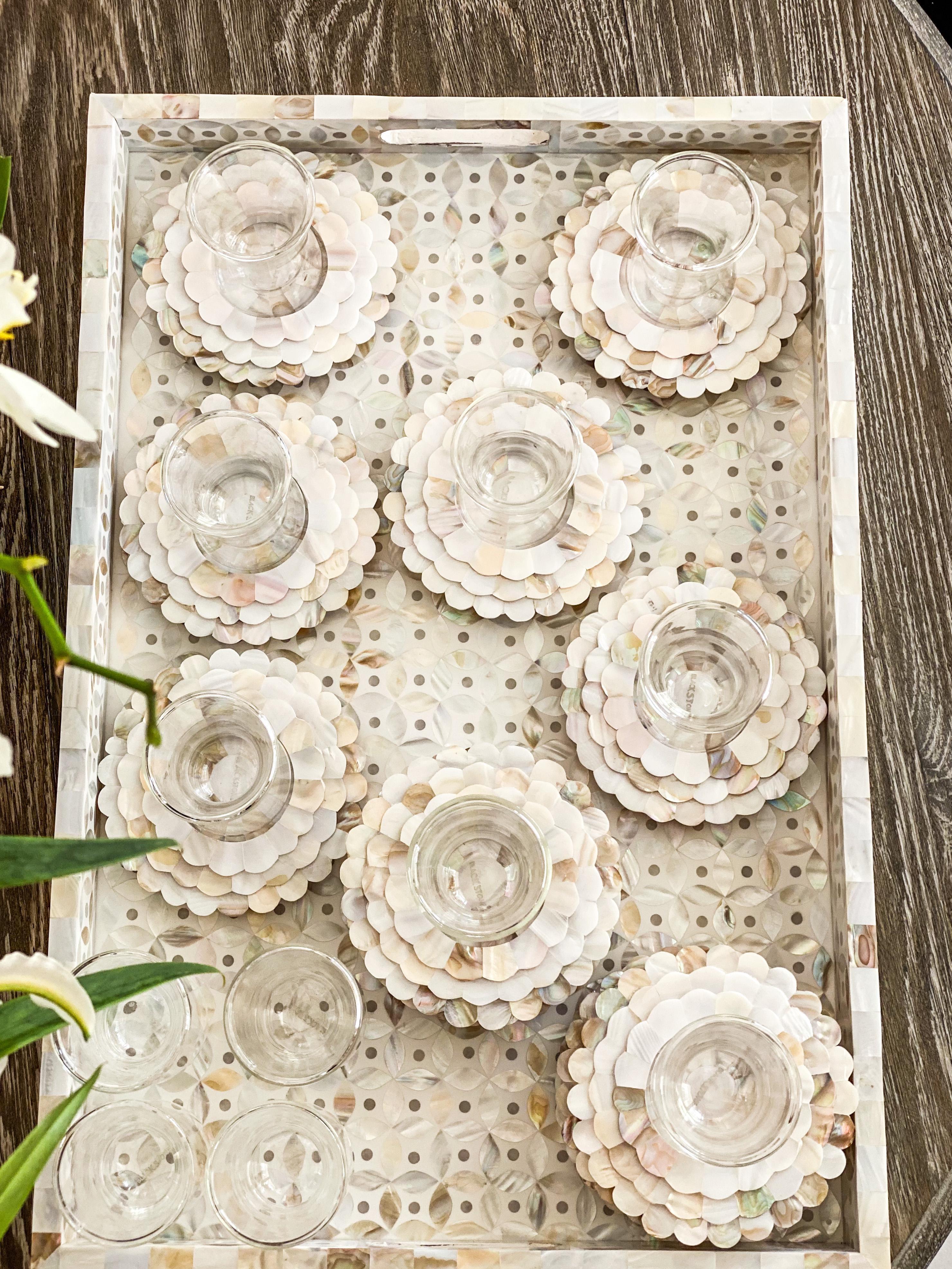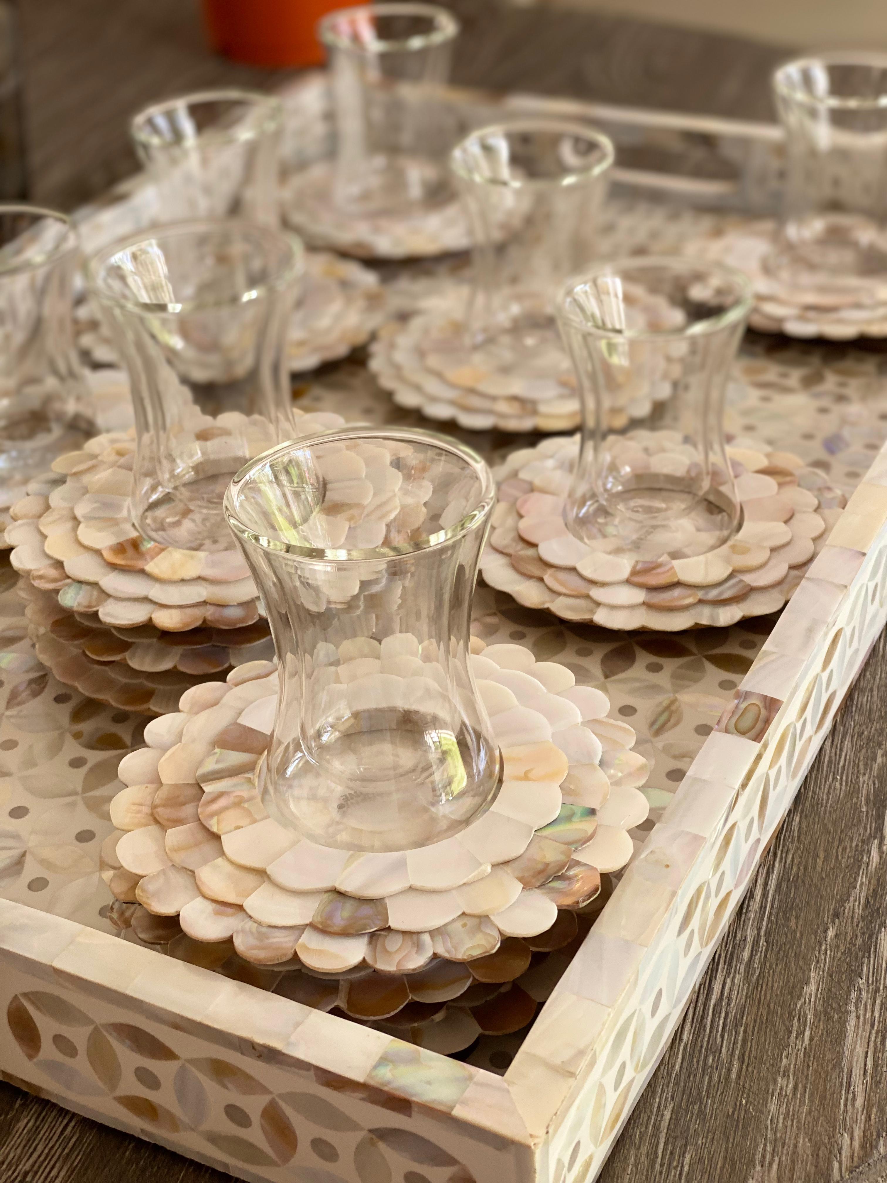 Introducing our stunning tea glasses with exquisite mother of pearl scallop design saucers. This piece is sure to elevate your entertaining experience with its intricate yet elegant design. Impress your guests with this special and unique touch of sophistication. Sold as a set of saucer and a tea cup.