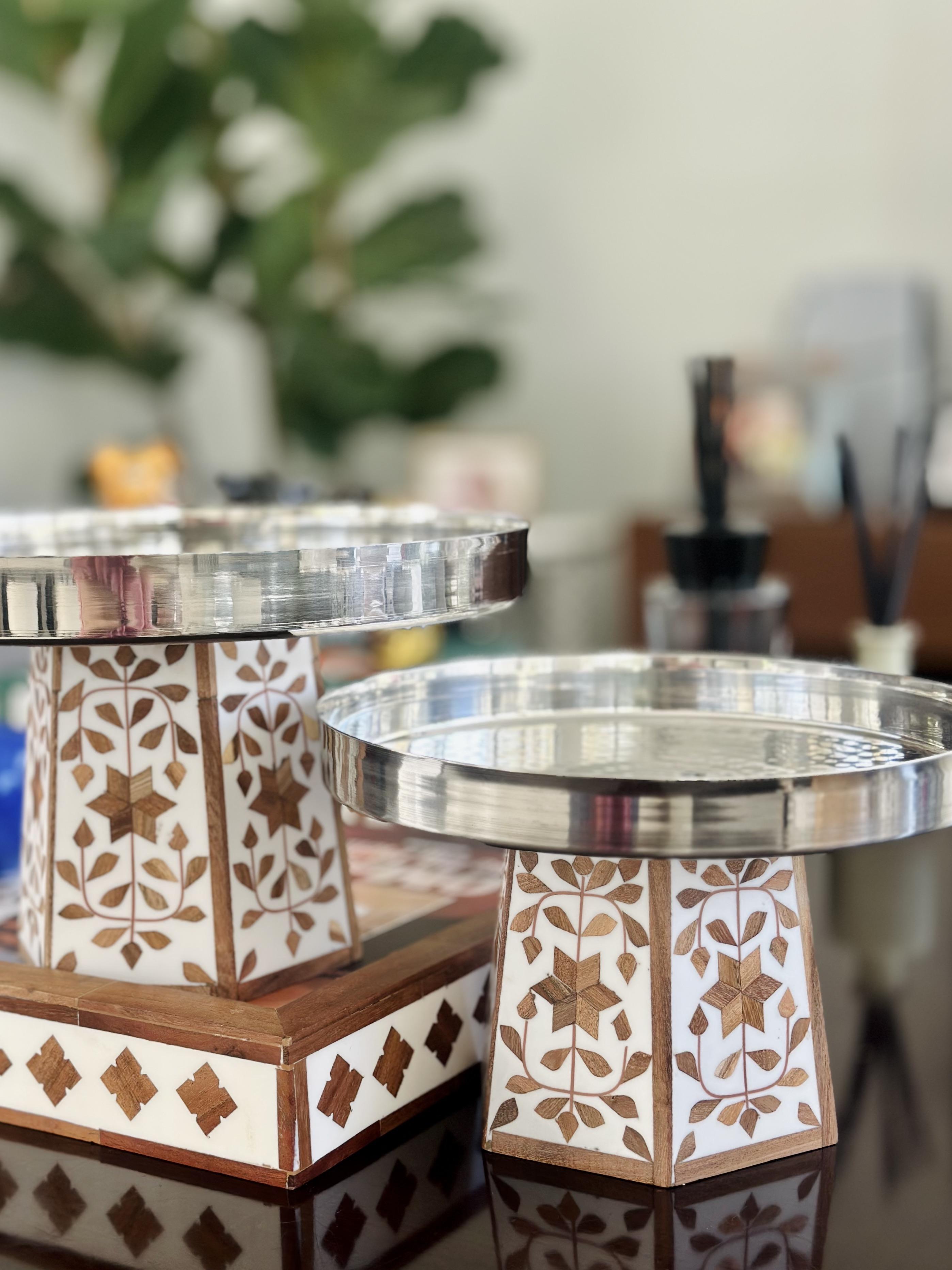 From the Zahra Collection, the Zahra Wood Stainless Stand beautifully blends natural warmth with timeless artistry. Each piece features a hand-inlaid floral pattern in wood pattern, forming delicate petals inspired by the grace of Zahra — a symbol of beauty and light.