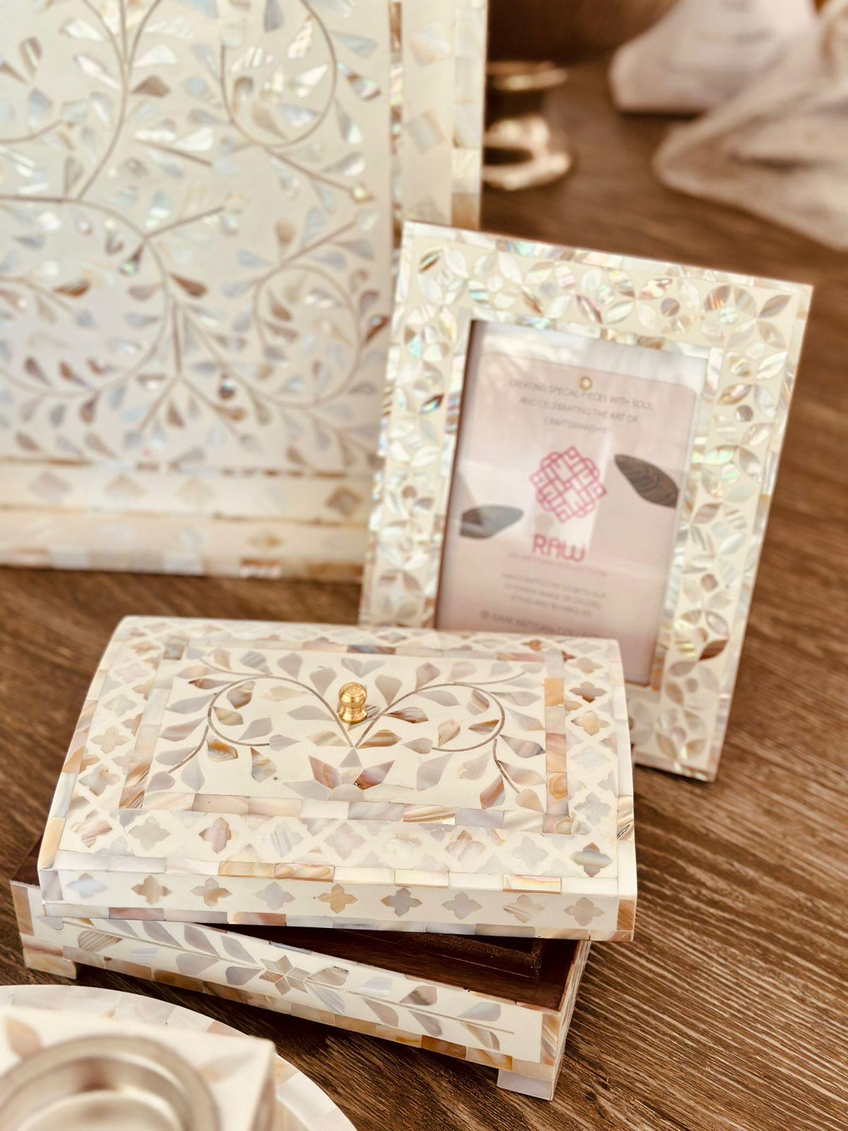 Capture youre cherished memories in style with our exquisite mother of pearl photo frames. Elevate your home décor with the elegance of handcrafted frames that beautifully showcase your photos. An ideal gift to personalize with your favourite pictures and add a touvh of luxury to any space. Size Big Suitable for photos 8*10 inch . Size small suitable for photos 5*7 inch.