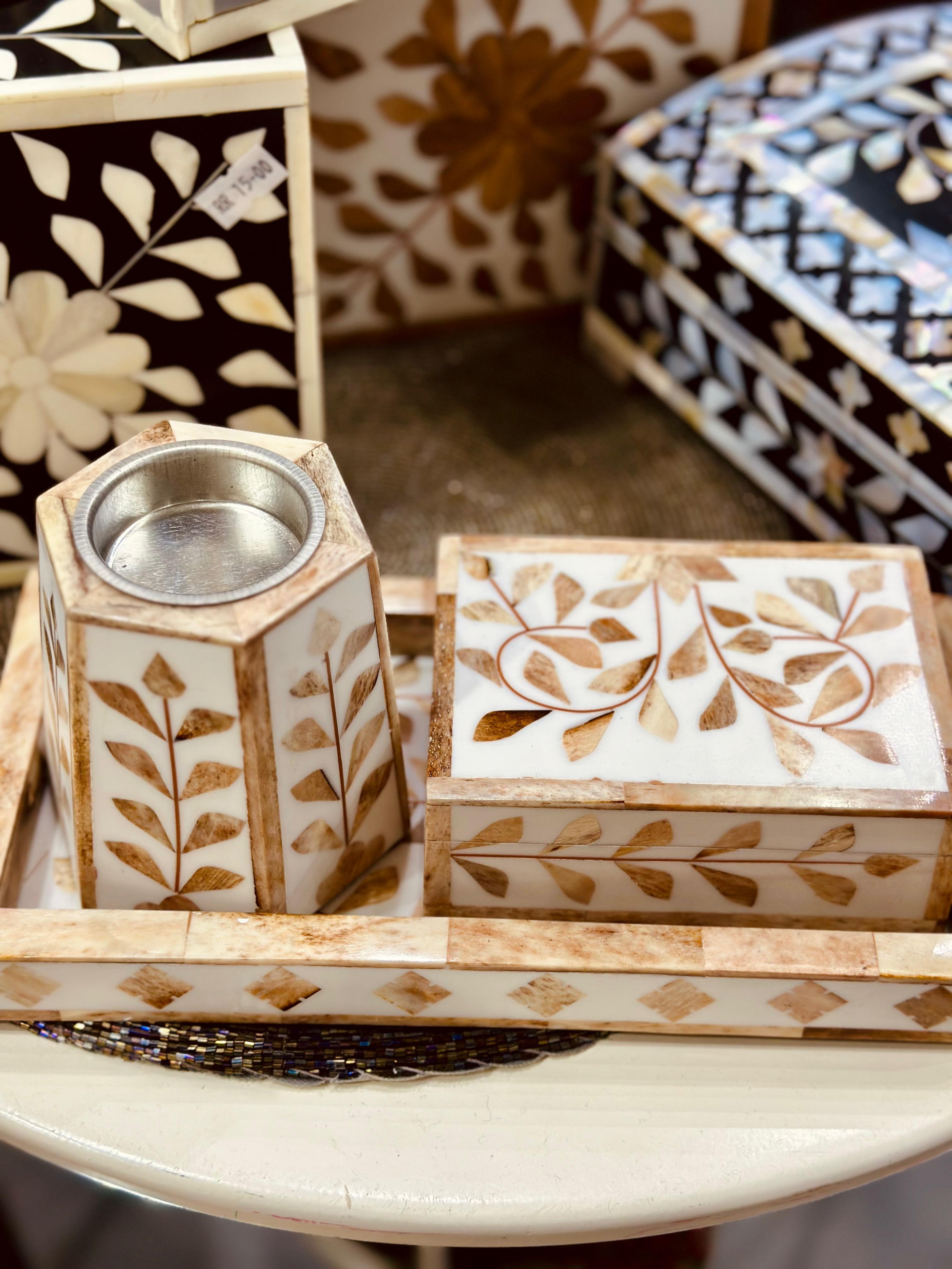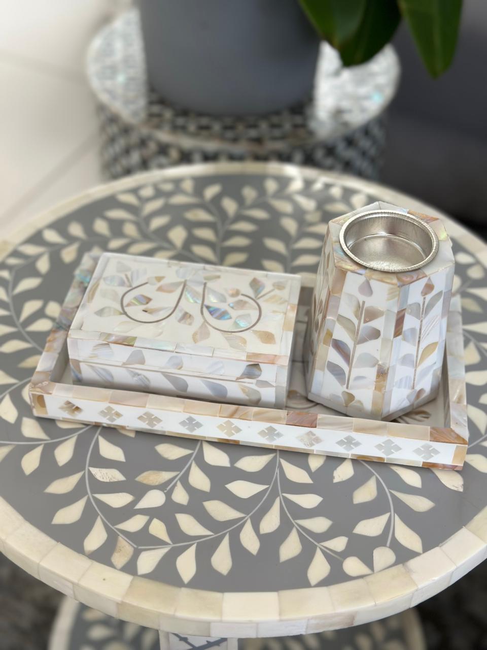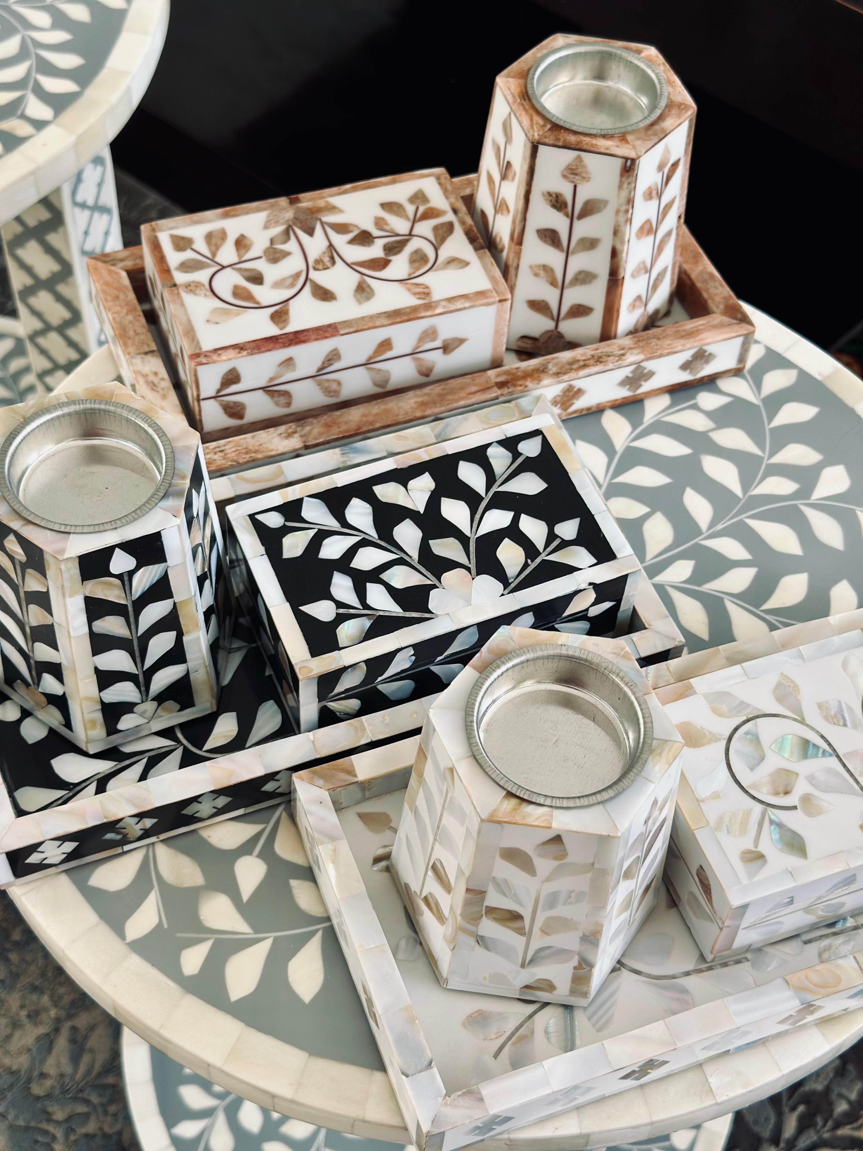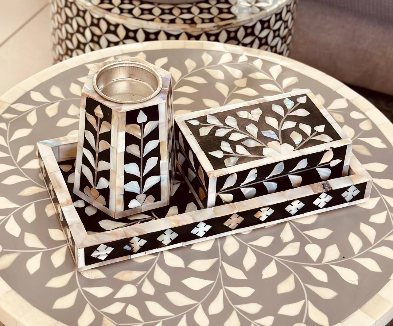 This elegent three-piece set, crafted from mother of pearl by skilled artisans is available in different colours. The intricate handwork of artisans infuses this burner set with a sense of indivisuality and refinement.