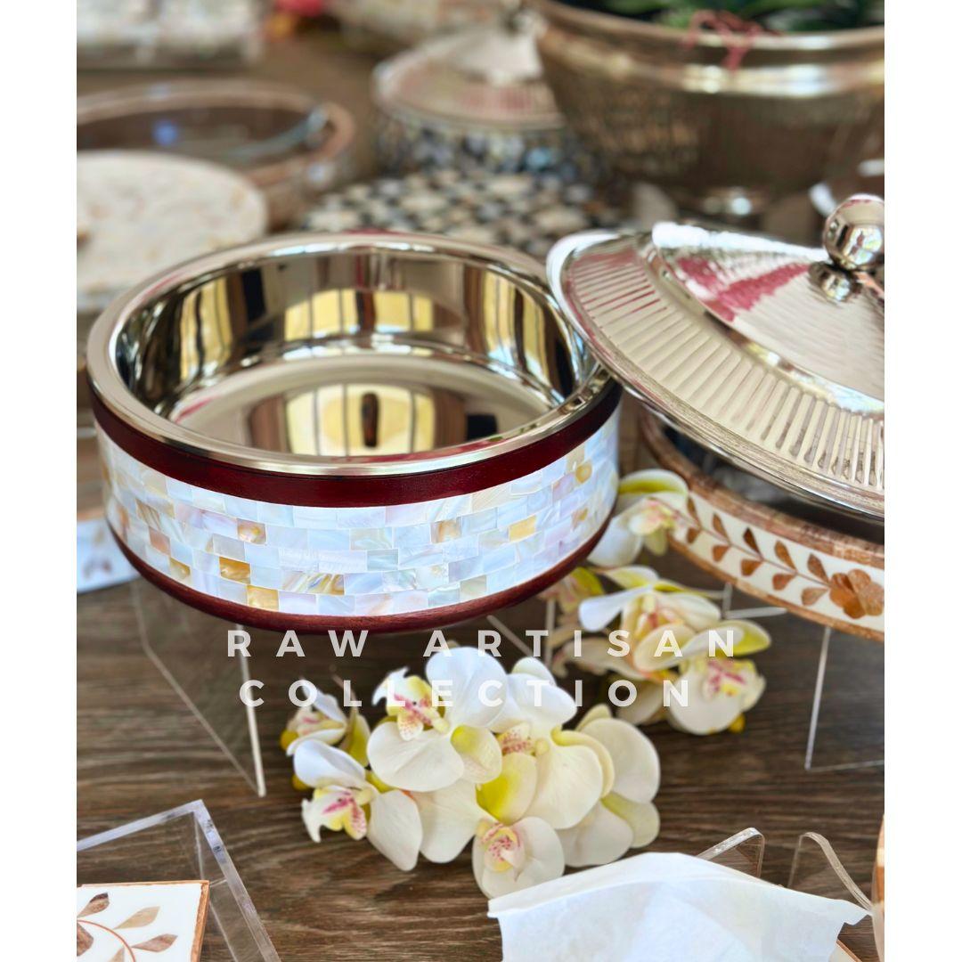 Enhamce your buffet with our exquiaite mother of pearl set , keeping your dishes warm and presentation elegant. Elevate your dinning experience with our unique pieces that will wow your guests and make your food taste even more delightful. Complete your table setting with threse classy and special pieces for a truly memorable gatherings.