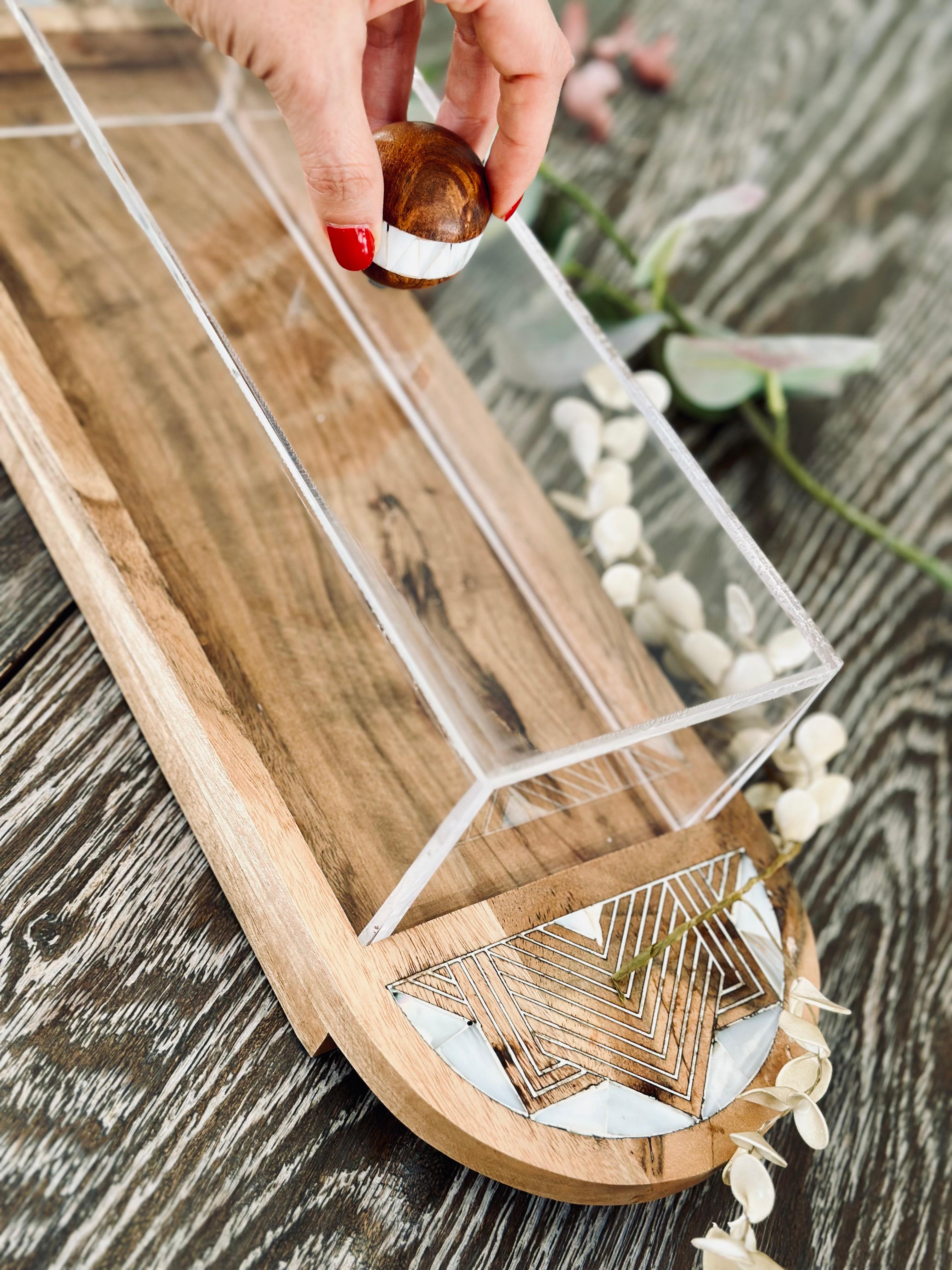 Elevate your hosting experience with ourexquisite multi-task tray, embellished with stunning mother of pearl accents. Completed with an acrylic cover to maintain the freshiness of your food. Perfect for serving both savory and sweet treats. Ideal for intimate gatherings . Guarantees to leave a lasting imprrssion on your guests.