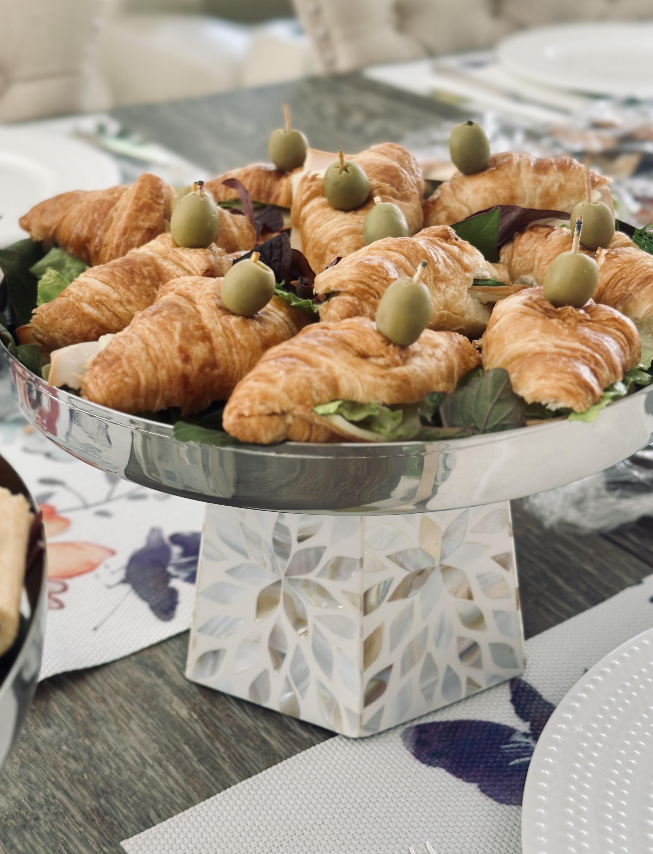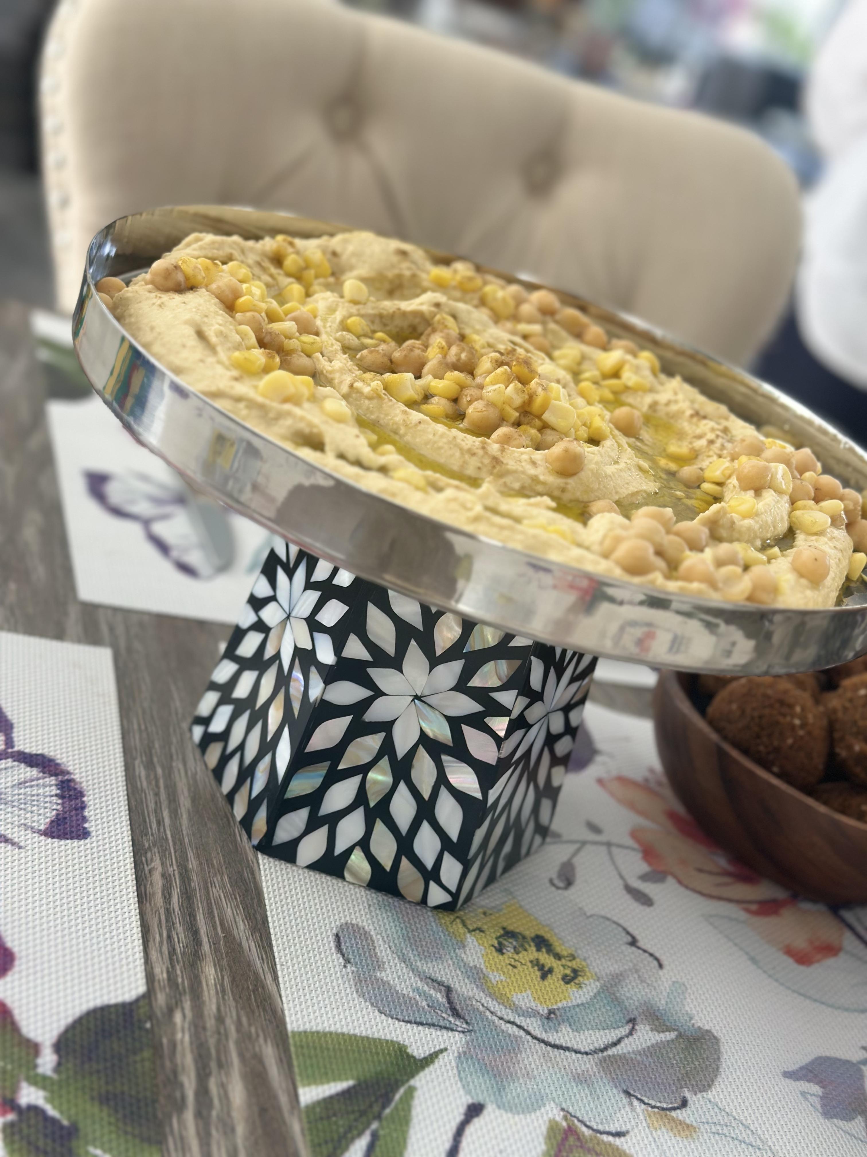 Radiant and refined, the Shamsa Stainless Pedestal Stand features a hand-inlaid mother-of-pearl sunburst design with a polished stainless steel top. A statement piece for serving desserts or savoury delights, blending timeless craftsmanship with modern elegance. Available in two different sizes , tall and short.