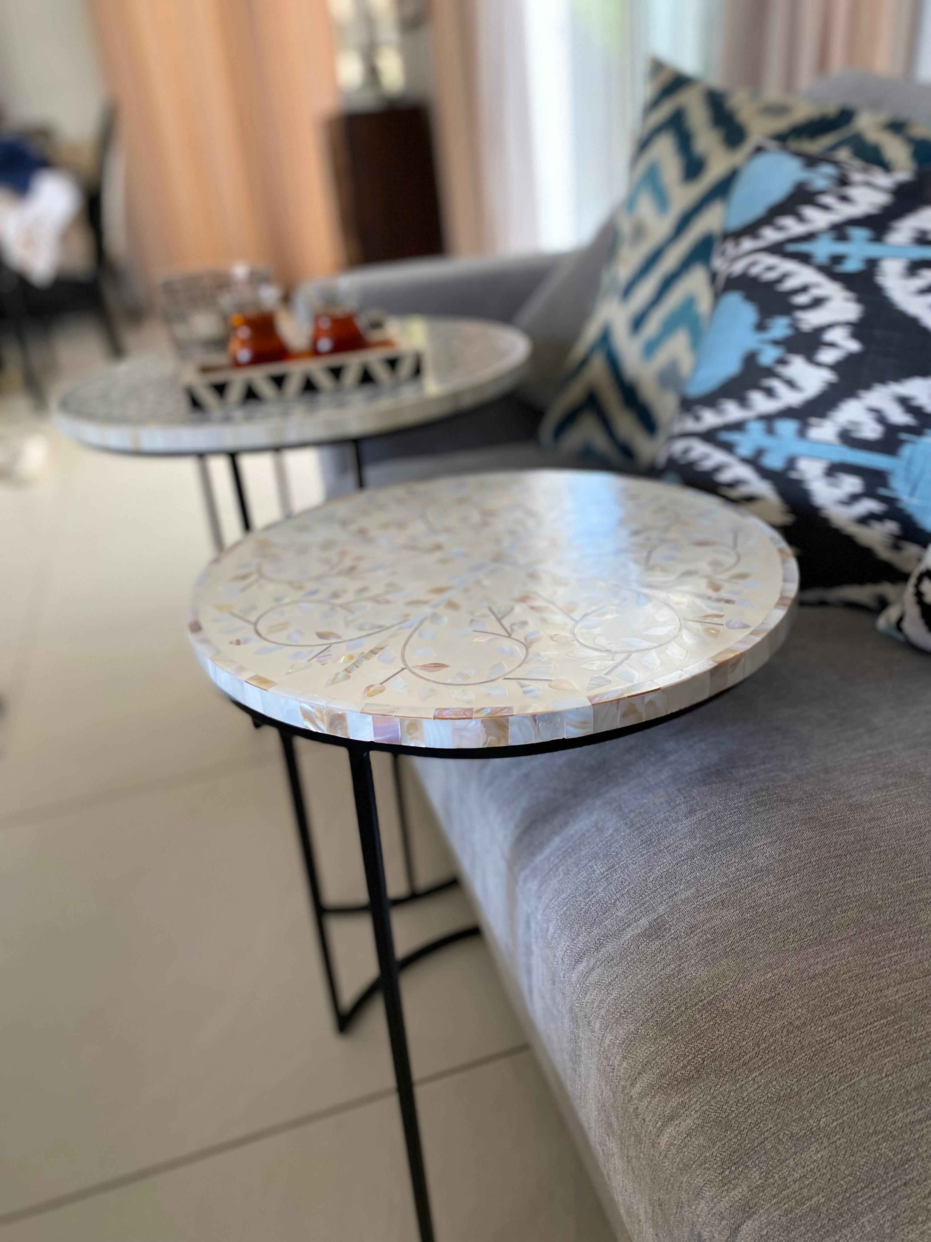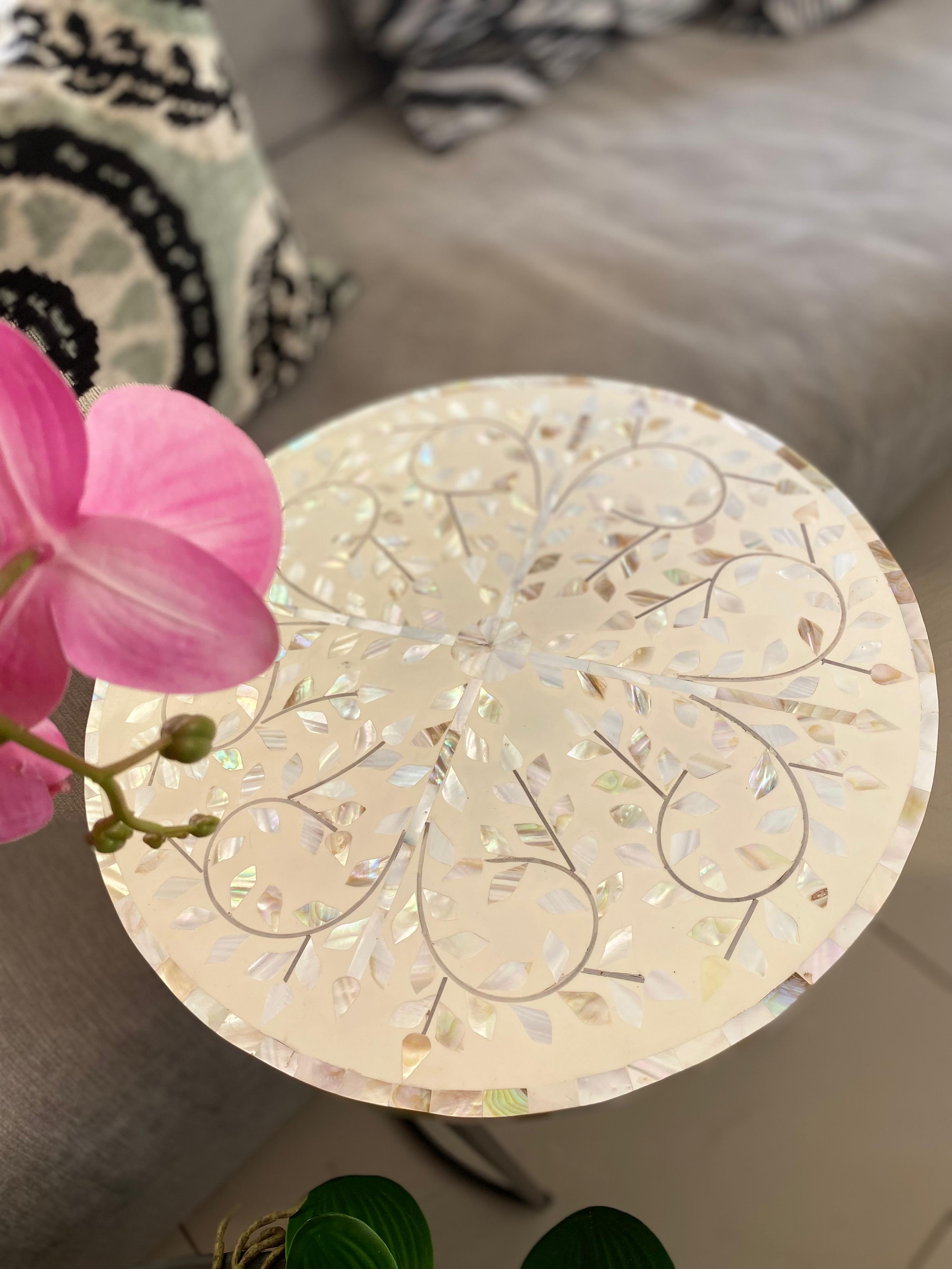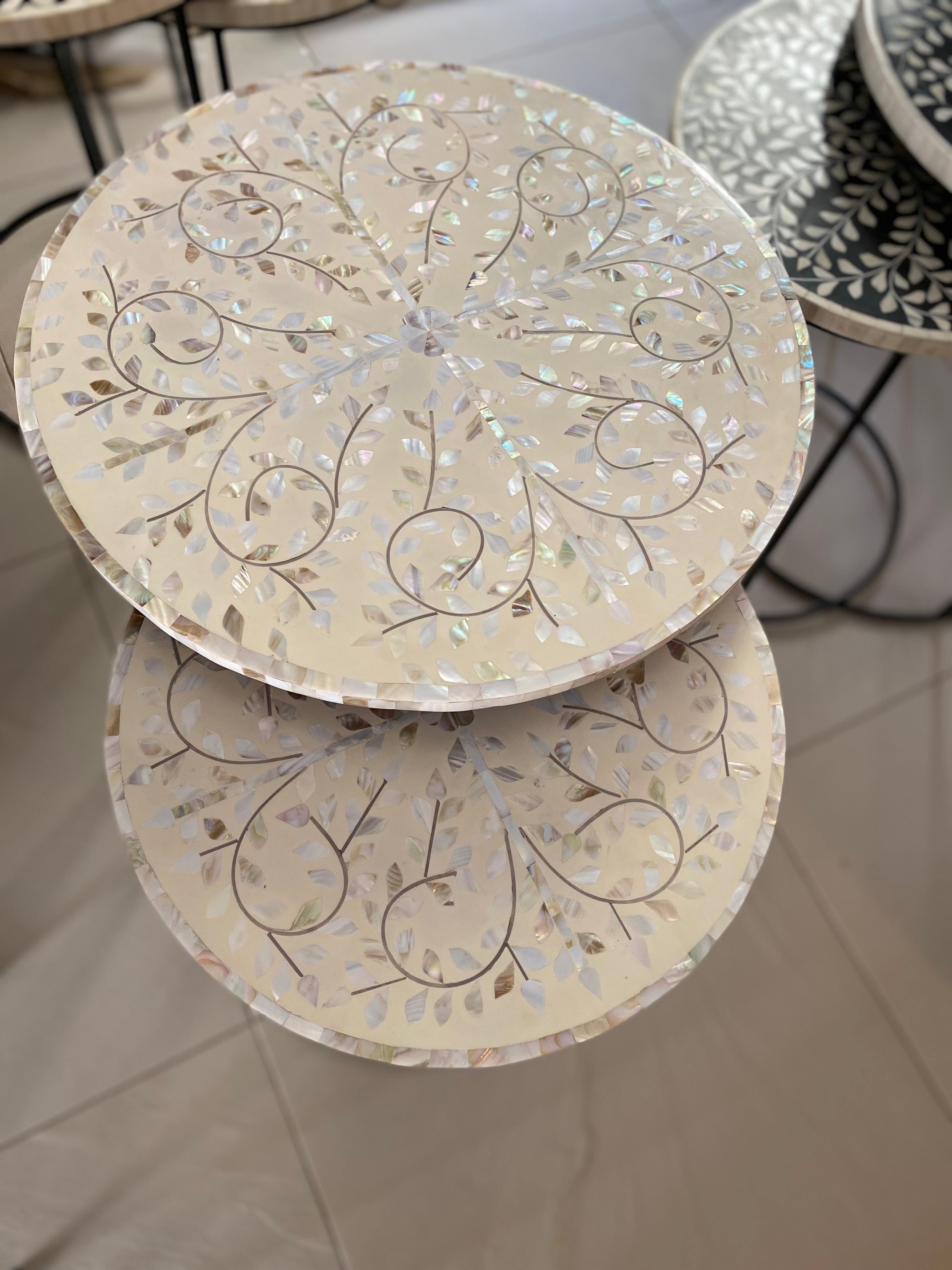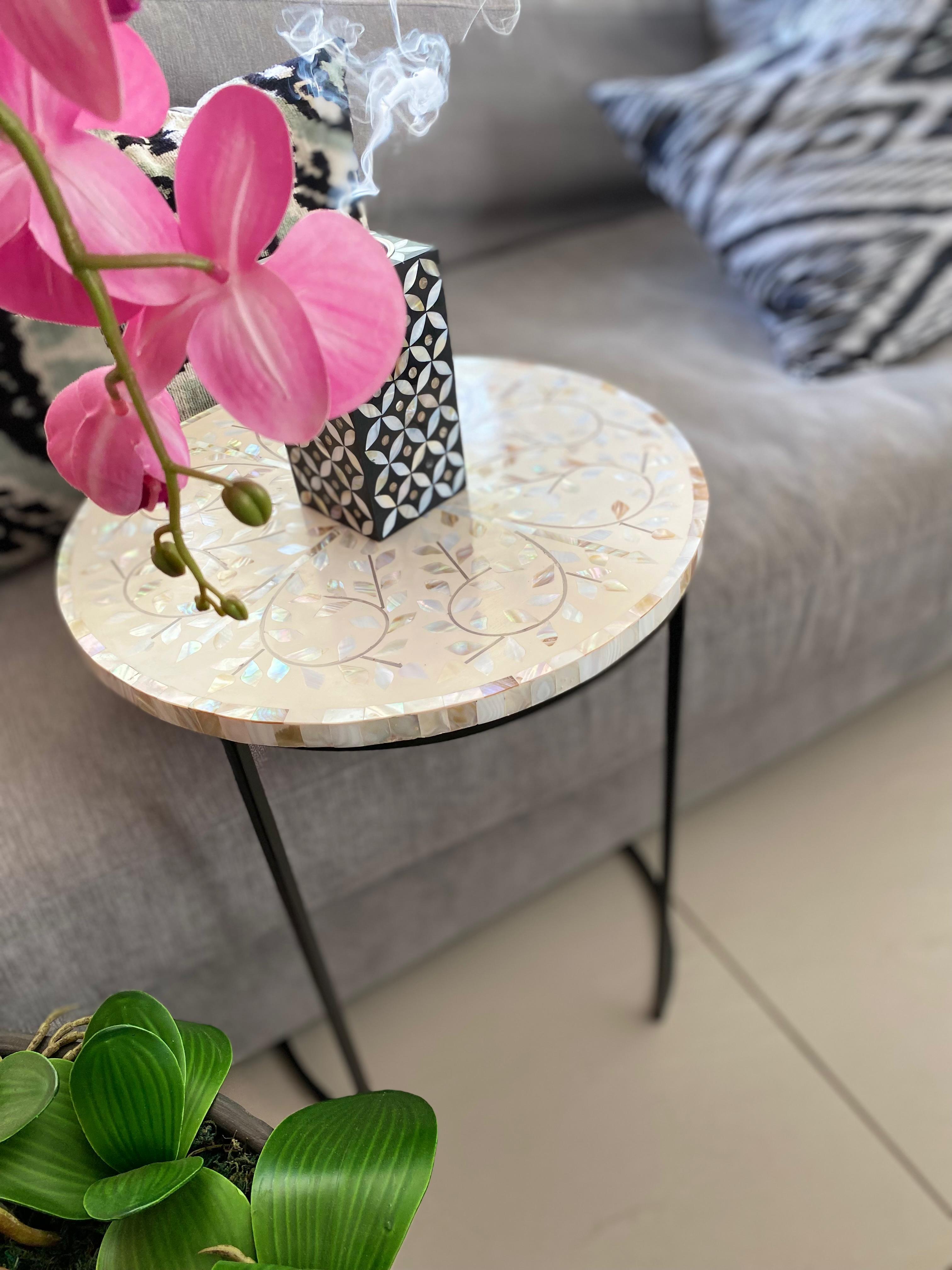 Introducing our exquisite collection of must-have side tables, meticulously crafted with elegant mother of pearl details in stunning floral patterns by our skilled artisan team. Available in twom sizws for convenient storage an easy placement next to your seating. These tables effortlessly blend practically with sophistication.