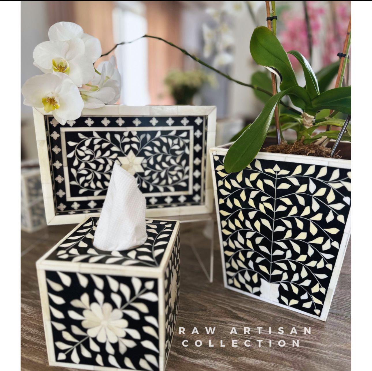 Introducing our exquisite tissue box that doubles as a functional art! Elevate any living space with its charming floral motifs and intricate patterns that beautifully complement any décor.Can be bought as a set with a matching tray and a pot.