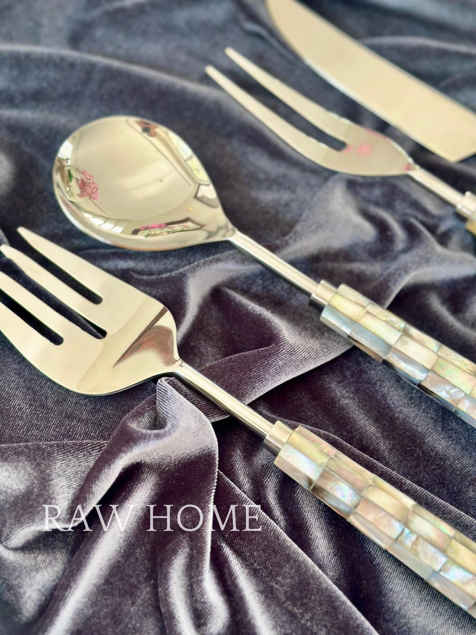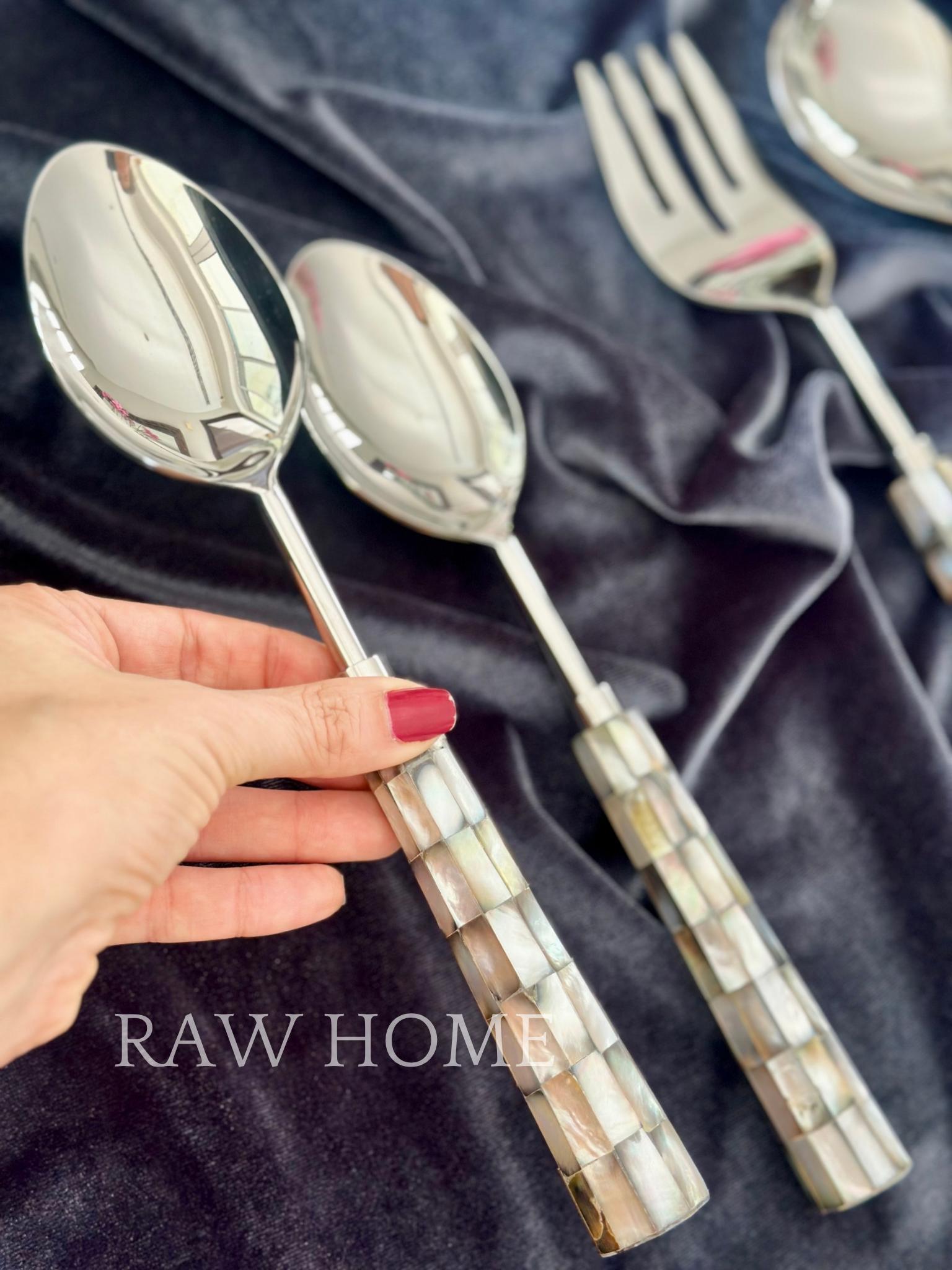 The timeless black mother of pearl serving cutlery exudes elegance with its embossed rounded handles, emanating a bold and courageous appearance sure to capture attention. The sturdy handle offers a strong grip that combines sophistication with simplicity. Available in four different sets, each set has two pieces. These cutlery pieces cater to a variety of food types.