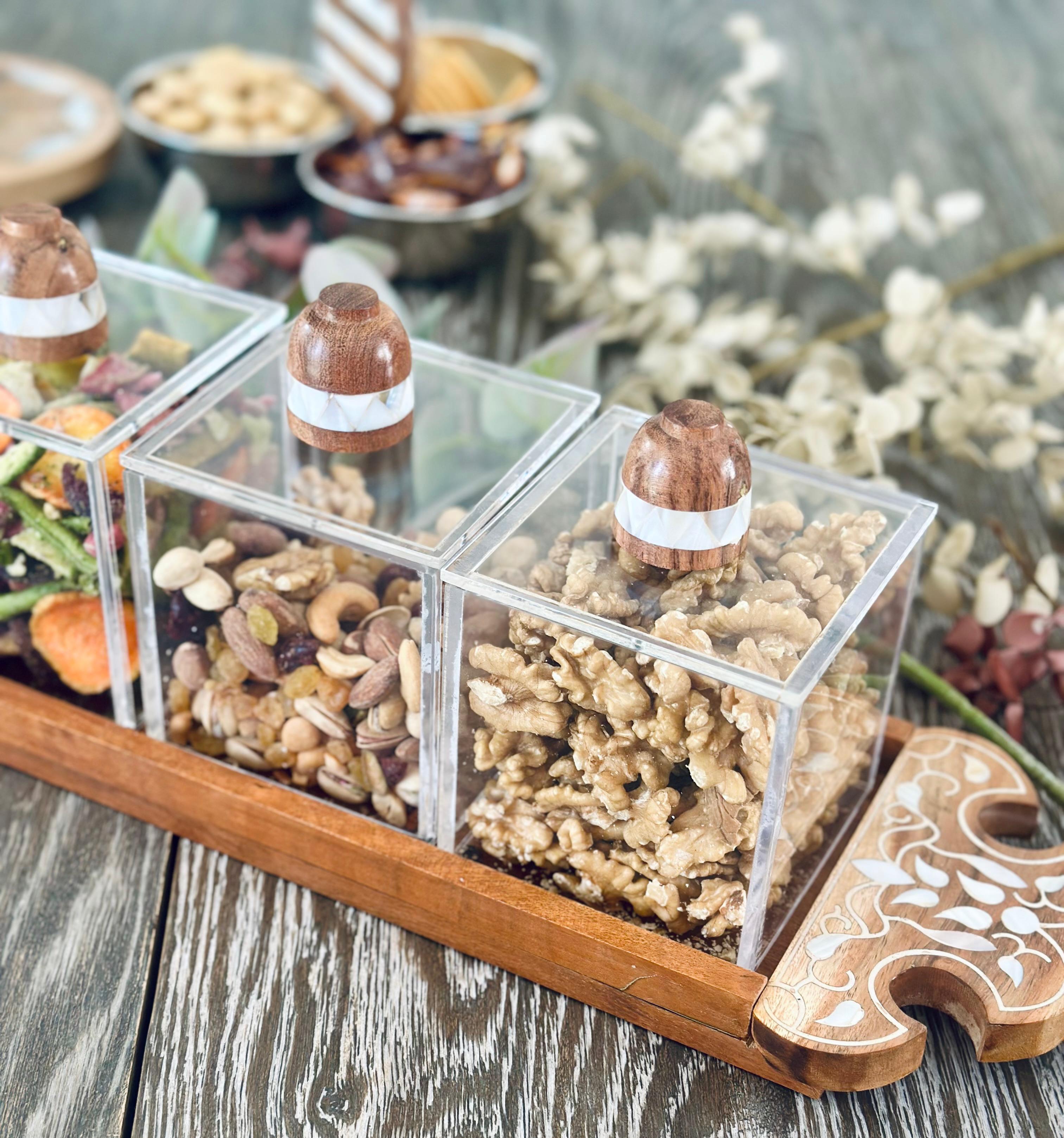Introducing our exquisite wood tray featuring a stunning mother of pearl floral design. Complete with three acrylic containers for storing your favourite snacks like dates, nuts, chocolates and trats . Ideal addition to your coffee table and gatherings.