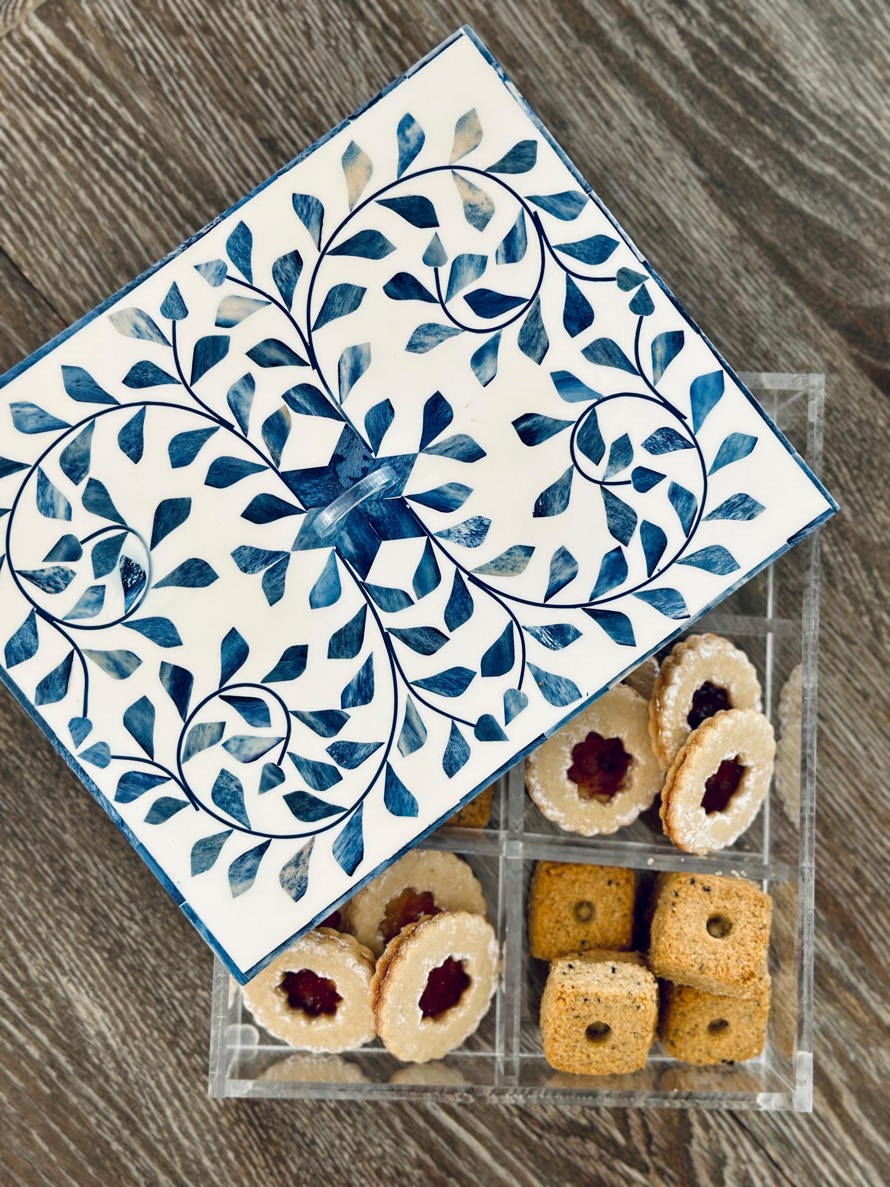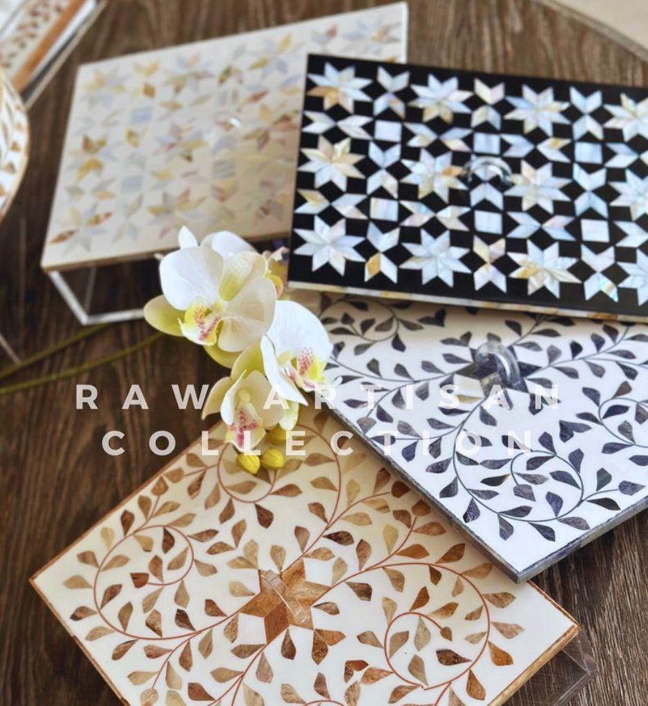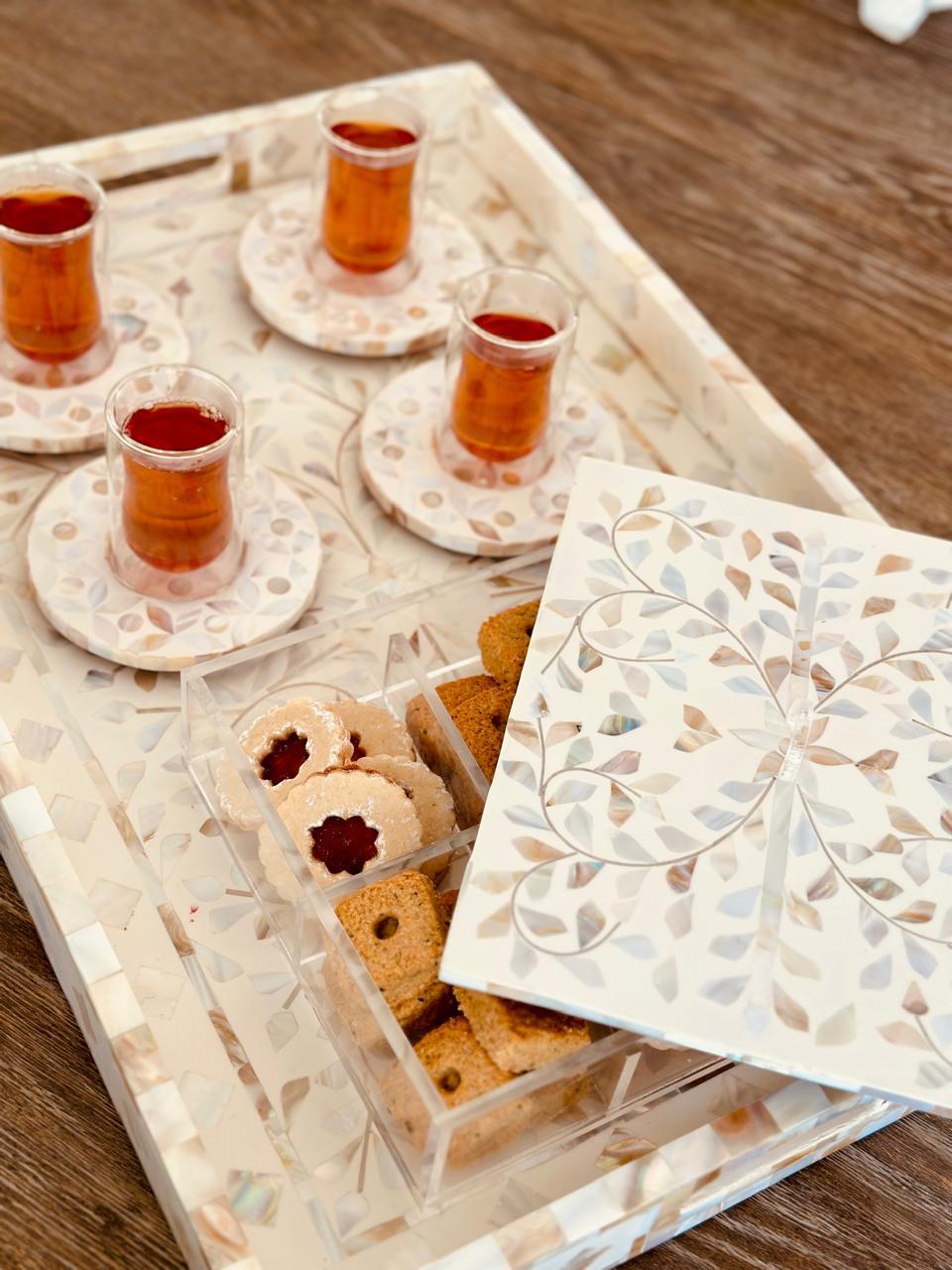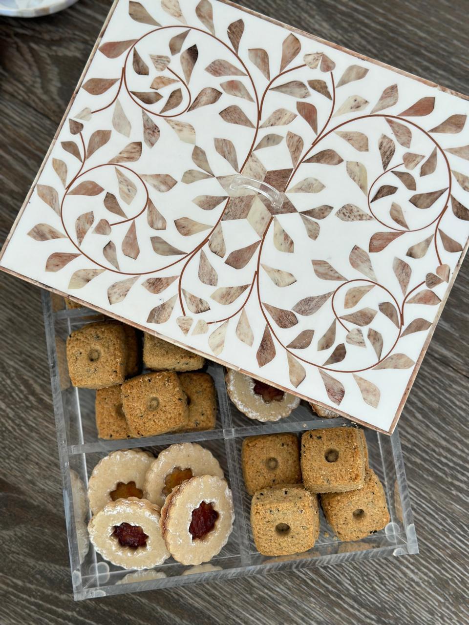 Unleash your creativity with our vibrant multi-purpose box featuring 6 partitions and colorful mother of pearl or bone inlay lid! Crafted from exquisite bone inlay with unique patterns exclusively for RAW Customers. This acrylic box is a versatile essential. Whether it's for organizing your tea bags, storing your cookies and dates, indulging in salty snacks, keeping your accessories tidy, there are endless possibilities to explore with this sensational box.