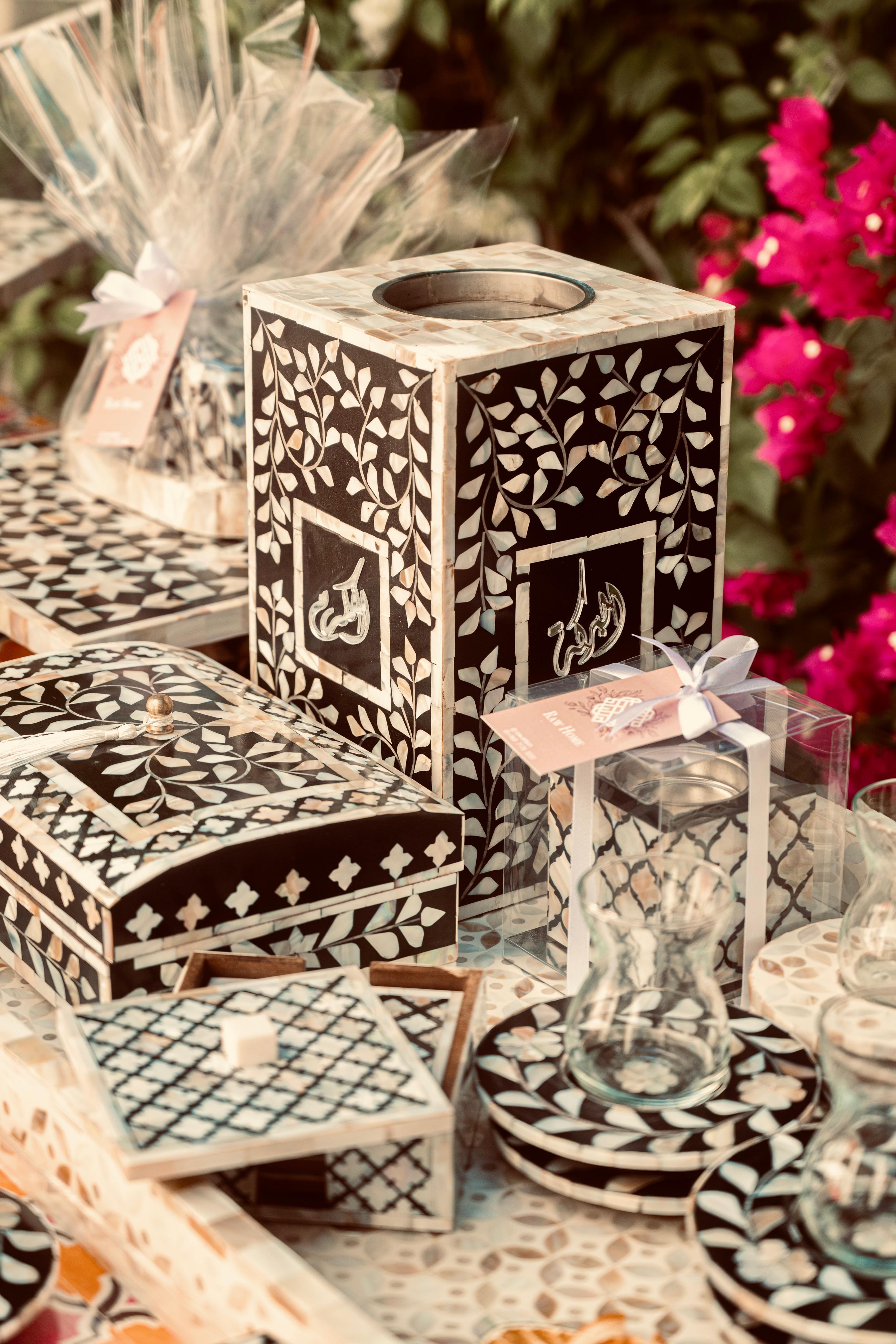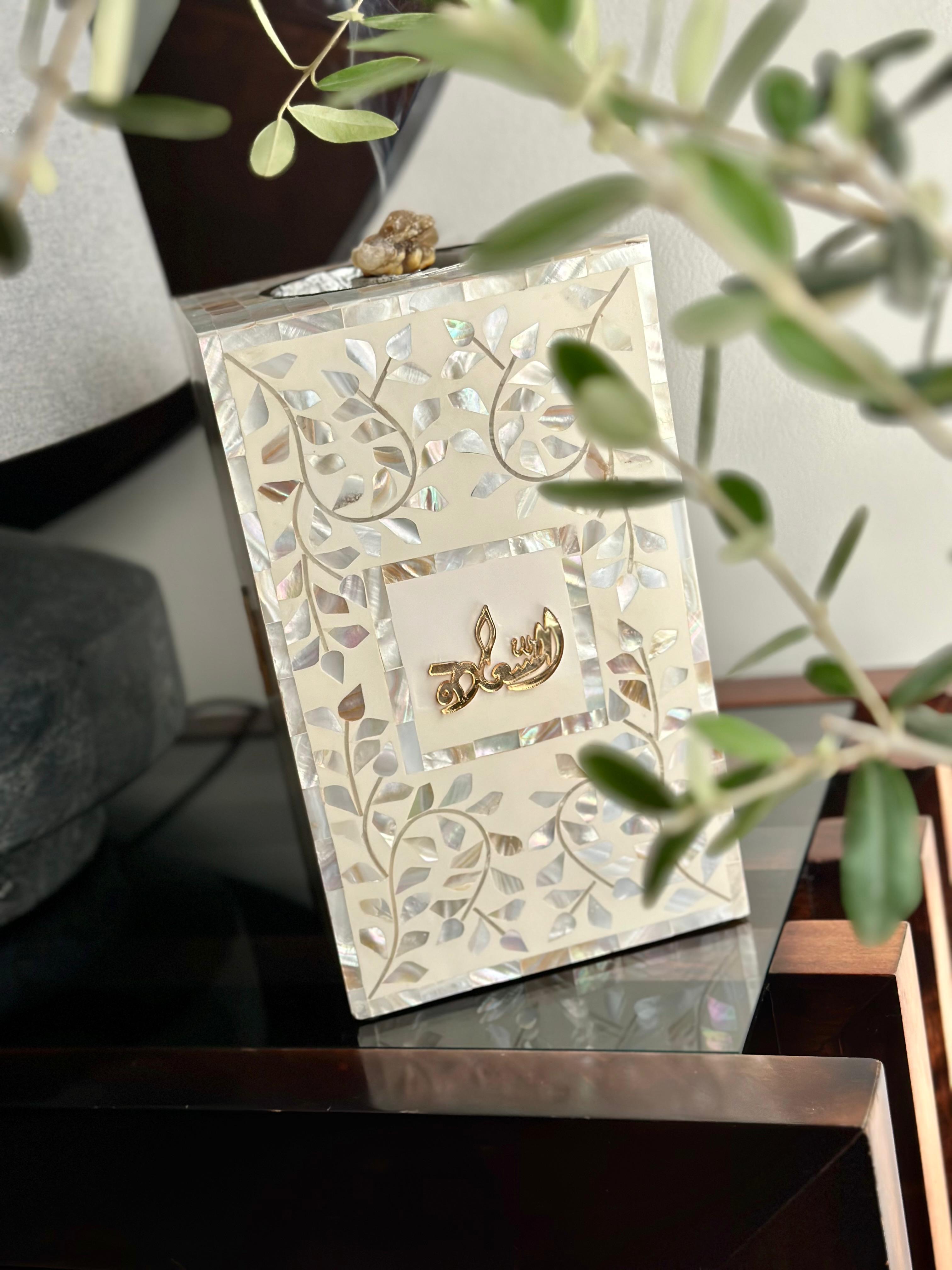 This beuty is a piece of art. Our exquisite mother of pearl floral burner/candle stand from -RAW SPECIAL COLLECTION- Expertly crafted by skilled artisans . The intricate arabic calligraphy detail create a timeless blend of classic and modern style.