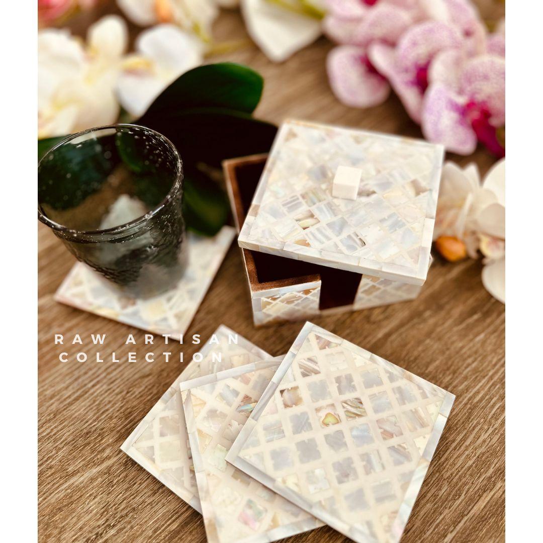 This set of mother of pearl coasters is elegantly packed in a sophisticated mother of pearl container . It's intricate inlay design offers a timeless and artistic appearance. Available in both white and black . These coasters compliment any décor style.