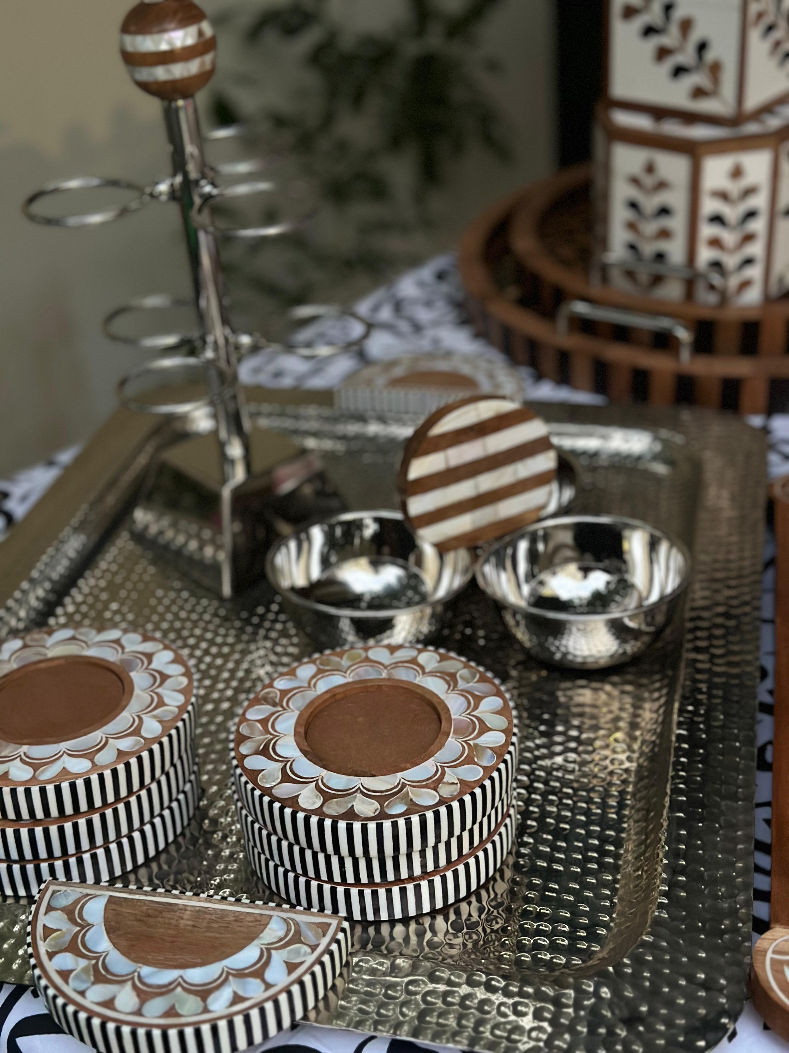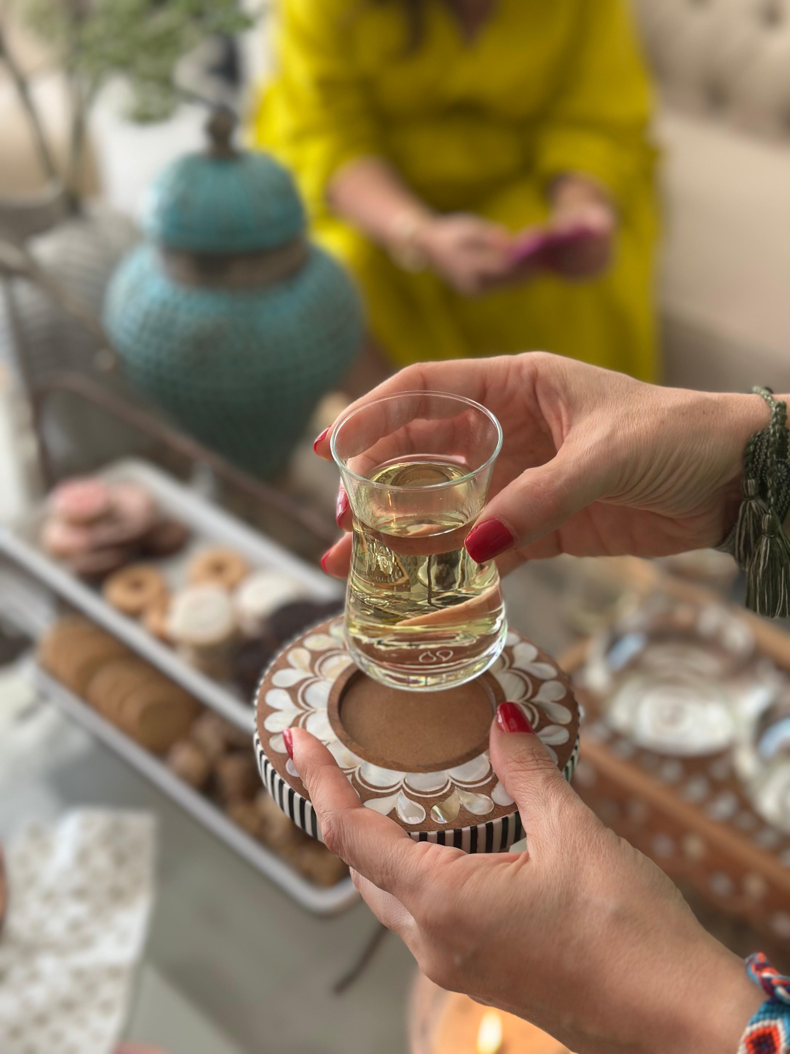 Indulge in the exquisite charm of savoring tea from our artisanal tea glass coupled with an elegantly handcrafted saucer. Adorned with intricate mother of pearl details, this set exudes sophistication and timelessness, making it an ideal gift and graceful addittion to your tea-serving rituals for cherished moments with family and guests.Comes in a set of 6.