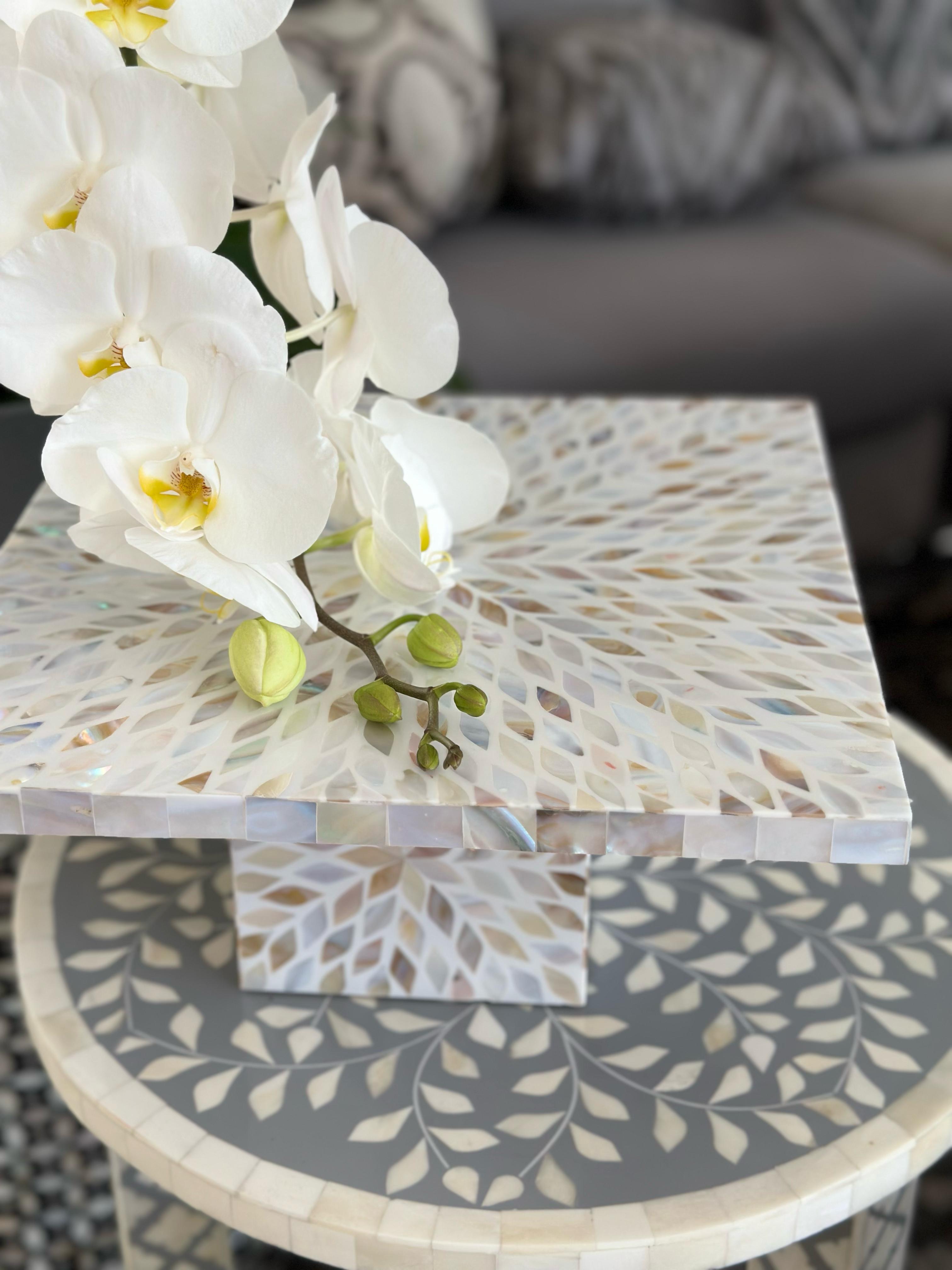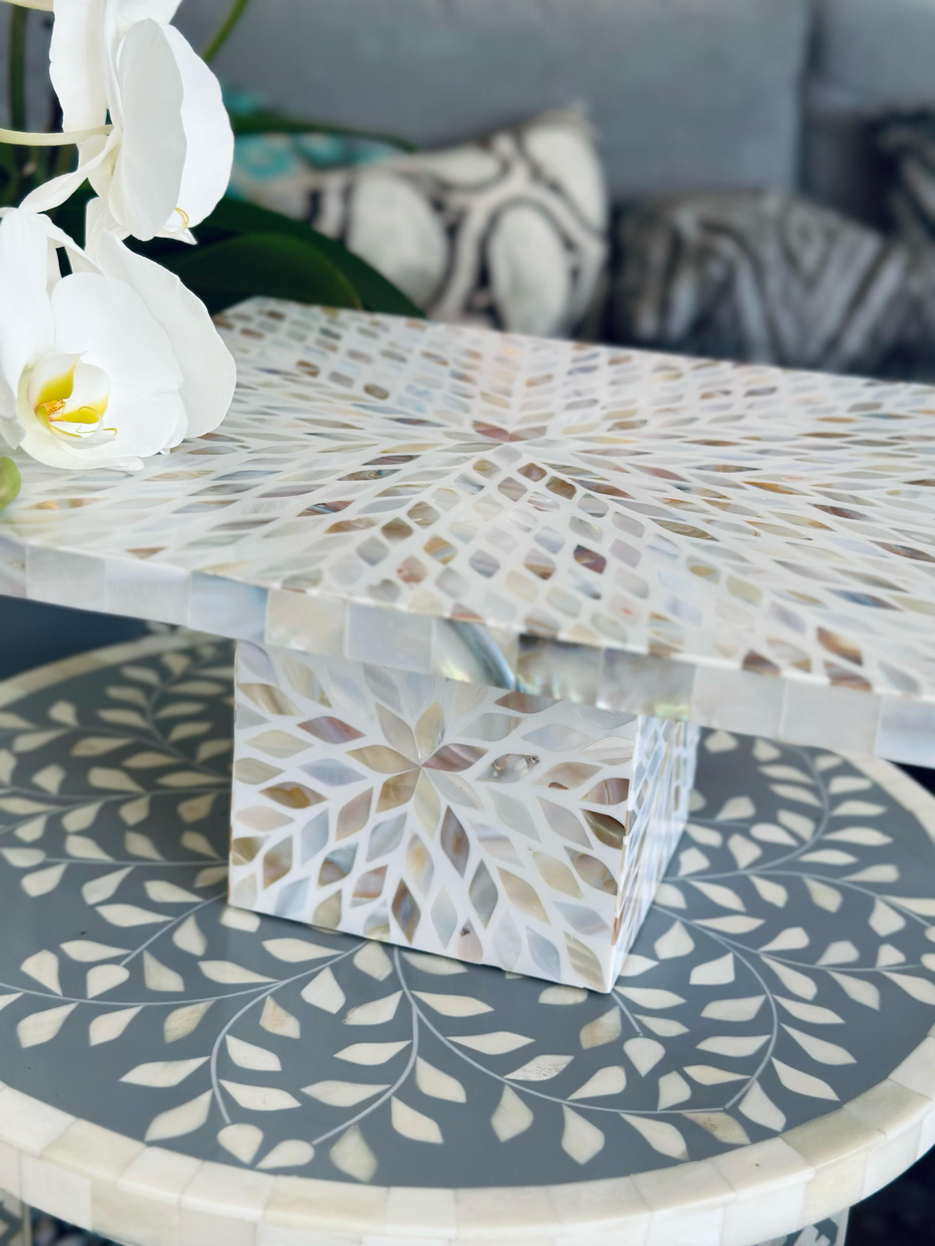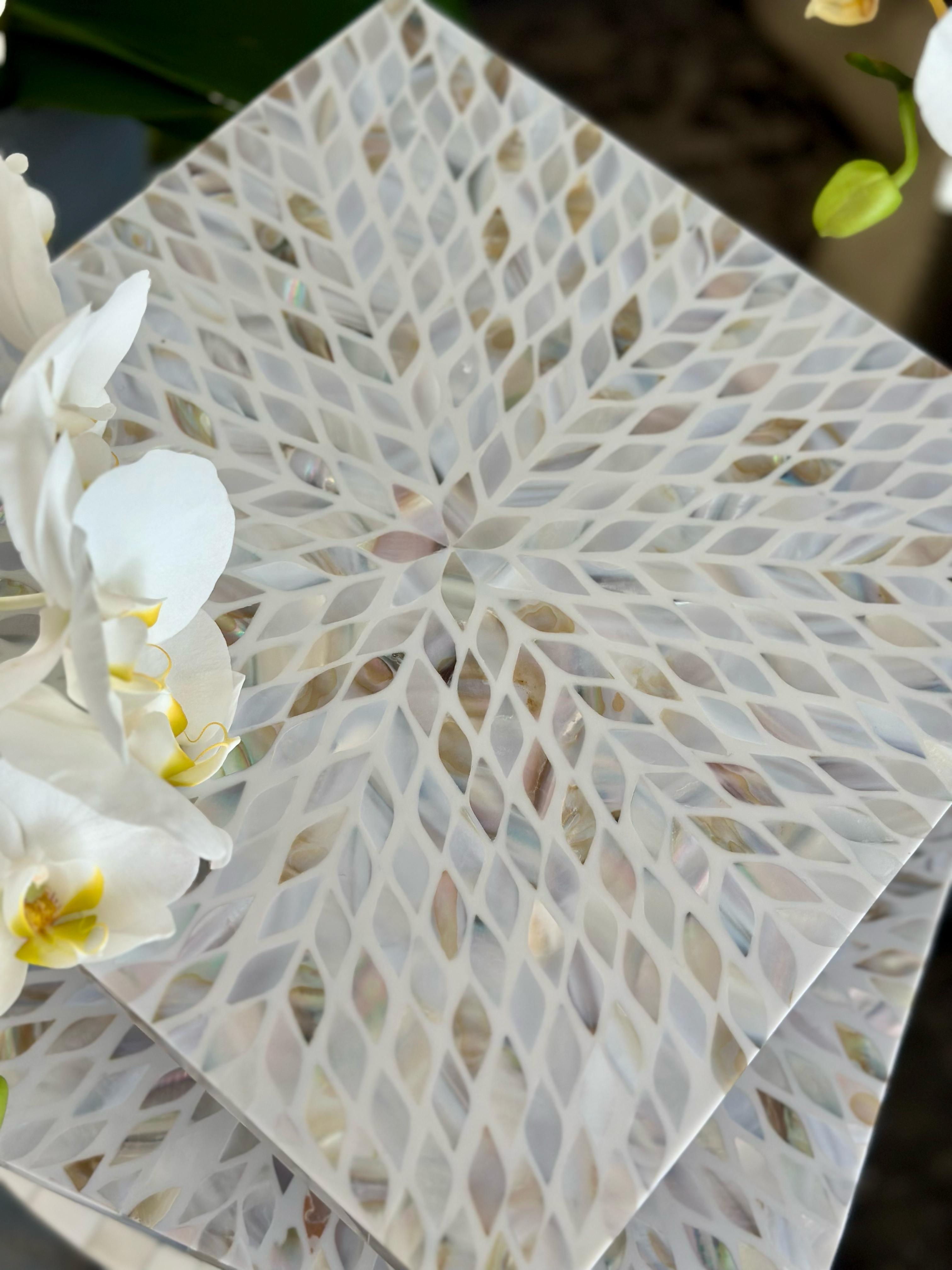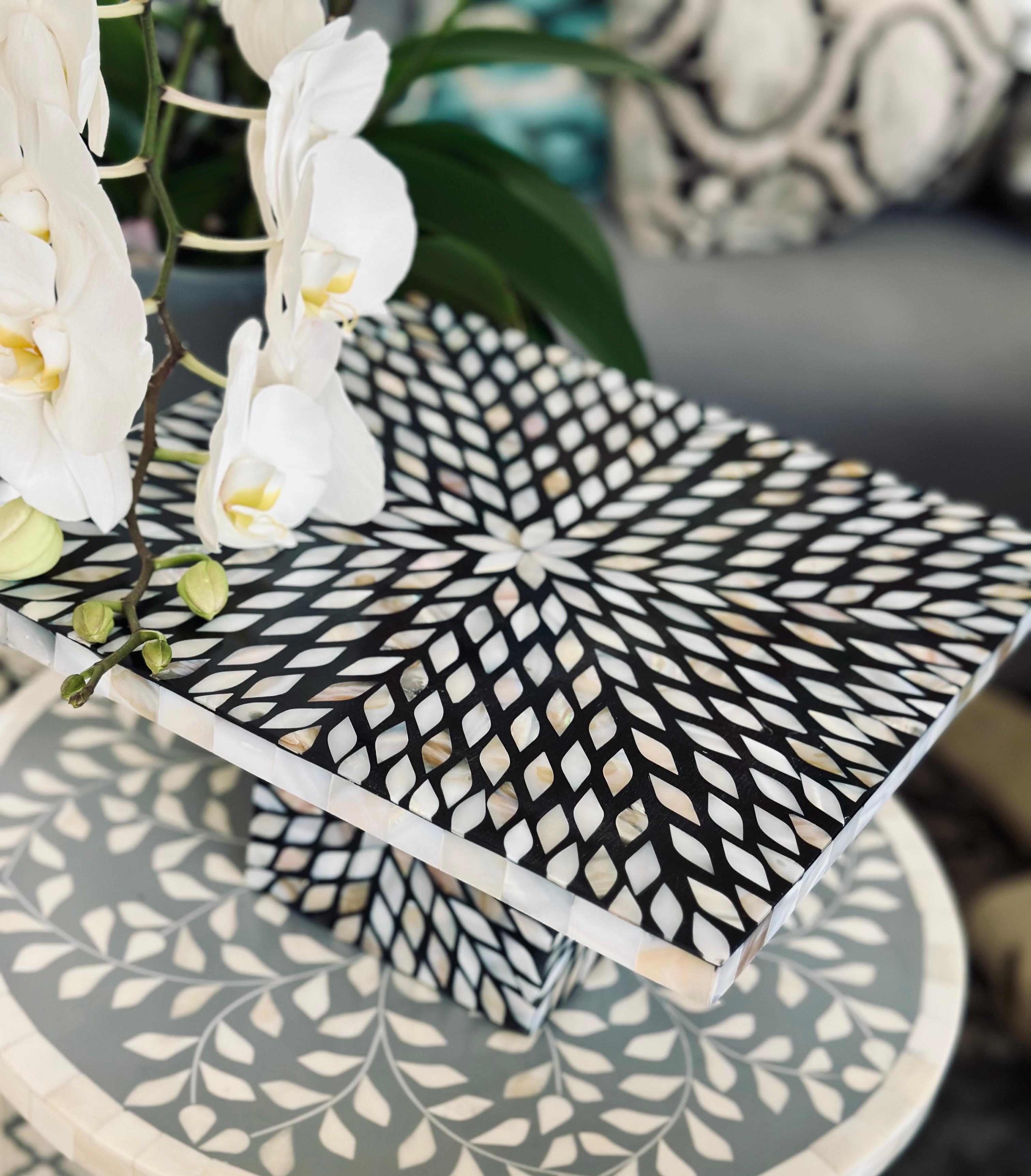 Radiant and refined, the Shamsa Square Cake Stand shines with its sunburst mother-of-pearl pattern. A symbol of light and celebration. Perfect for desserts or as a timeless display piece.