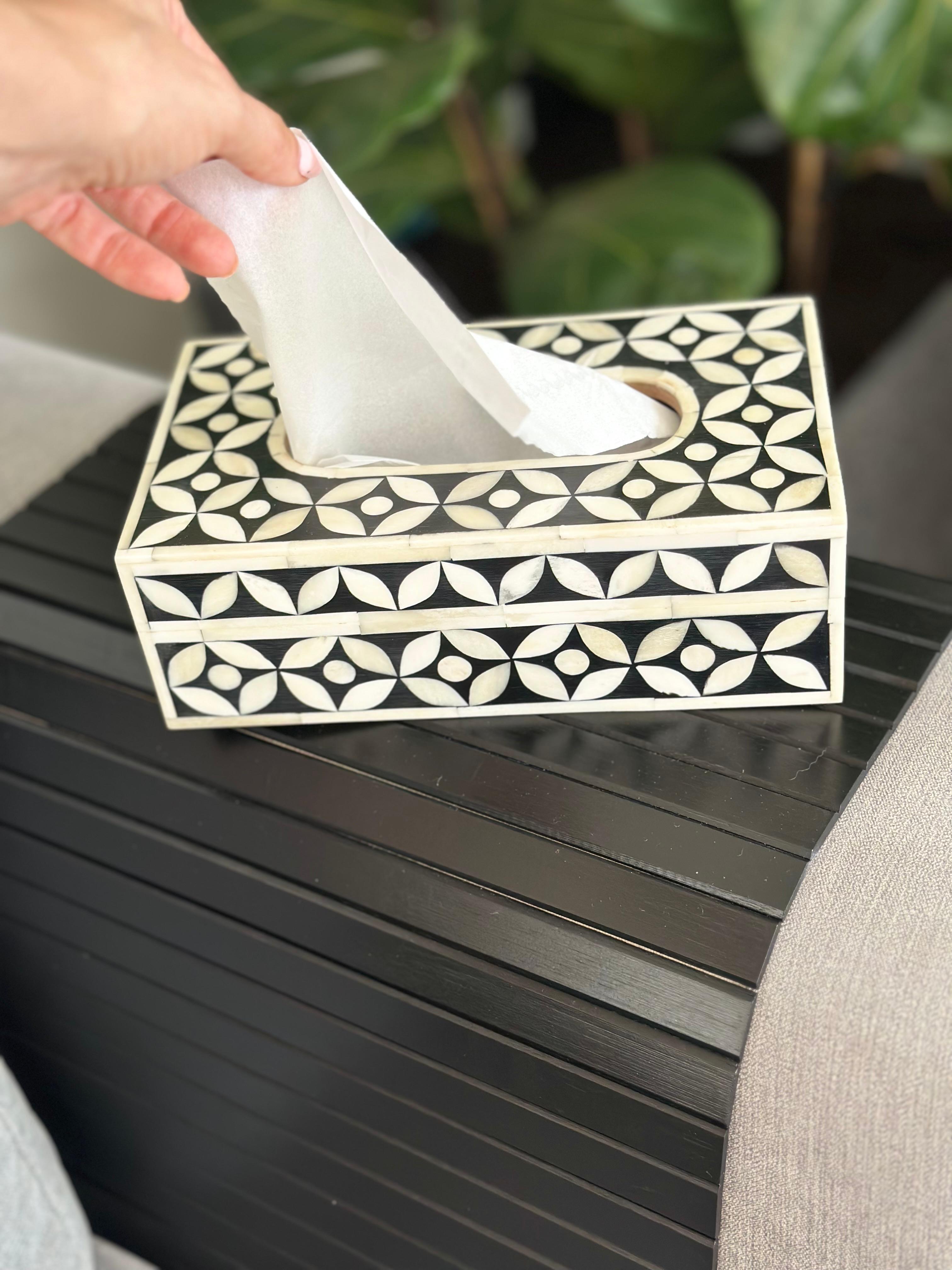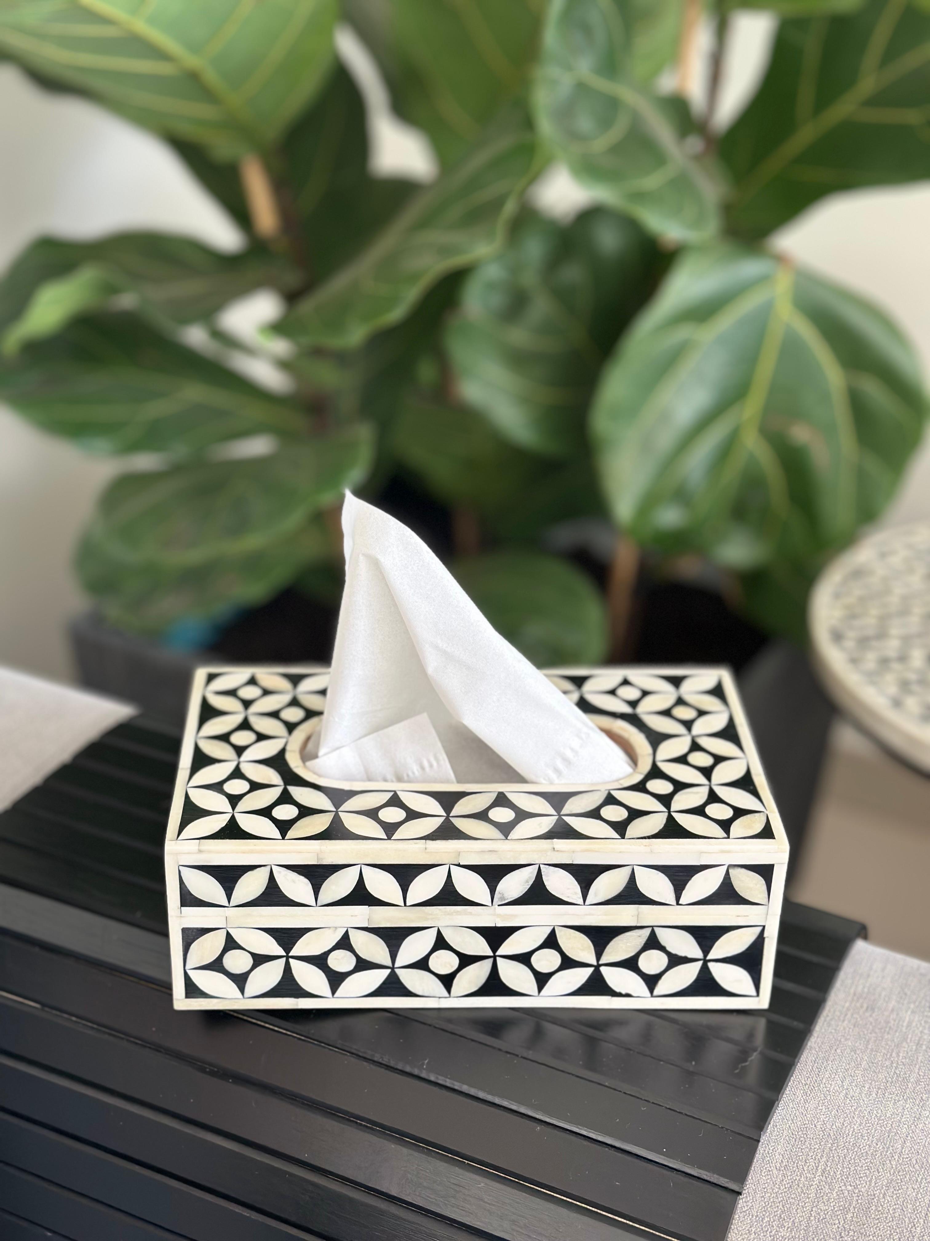 Inroducing our exquisite bone inlayl tissue box. Crafted and adorned with luxurious design. Its fusion of timeless grace and contimporary design creates a sophisticated piece that seamlessly elevates any living space, It's a must have addition to your home decor.