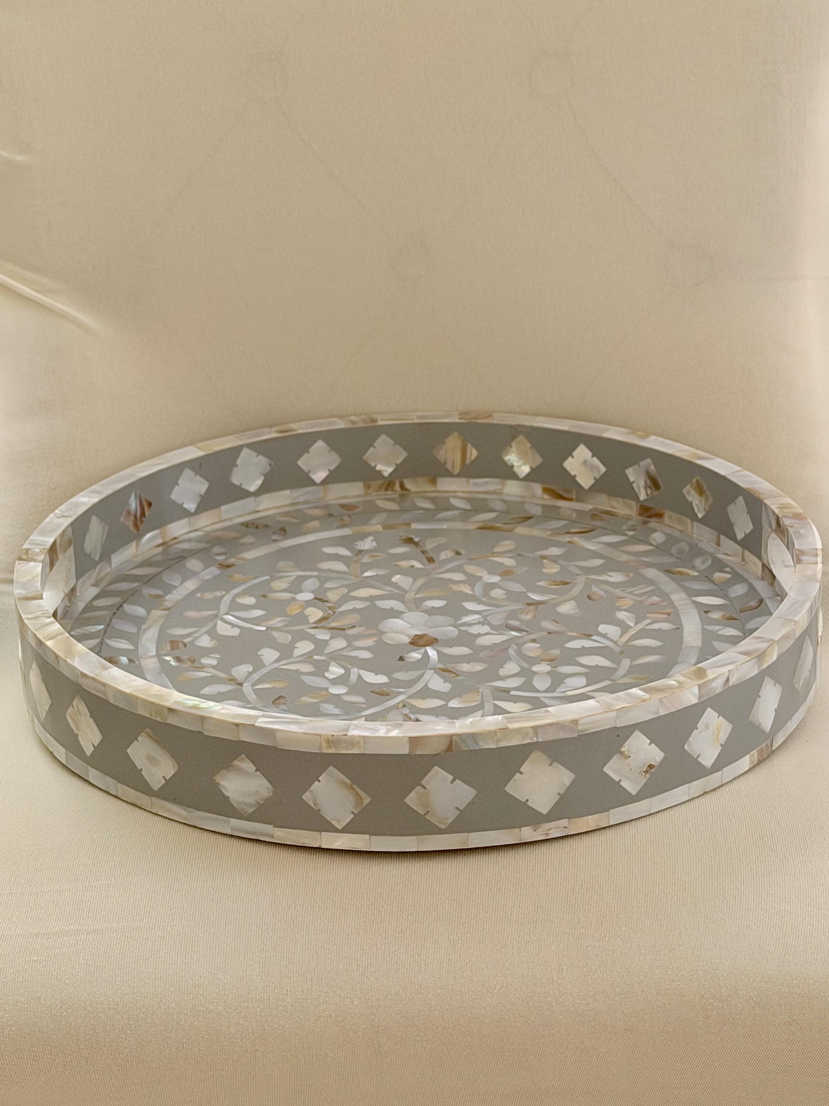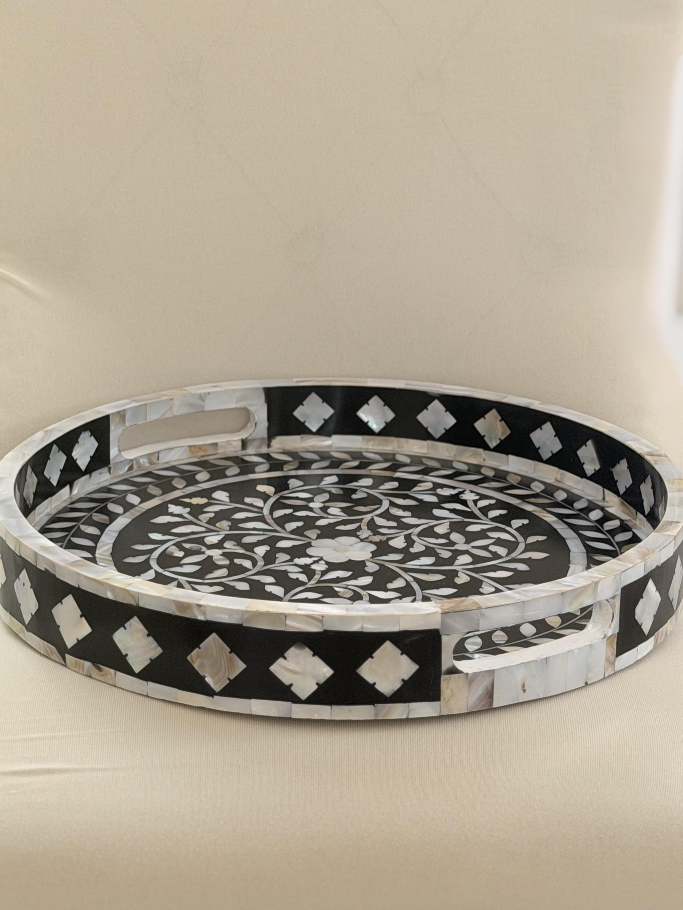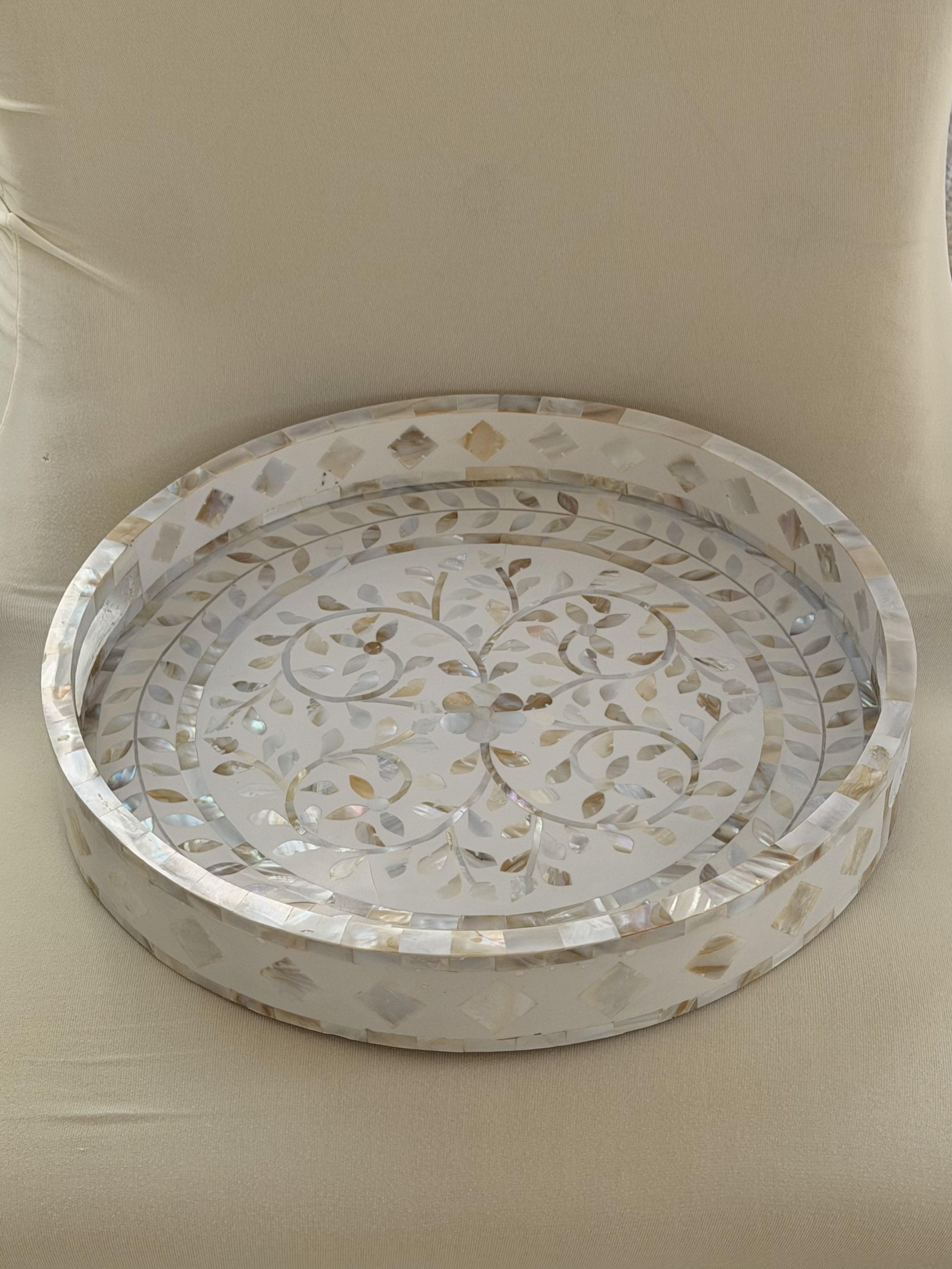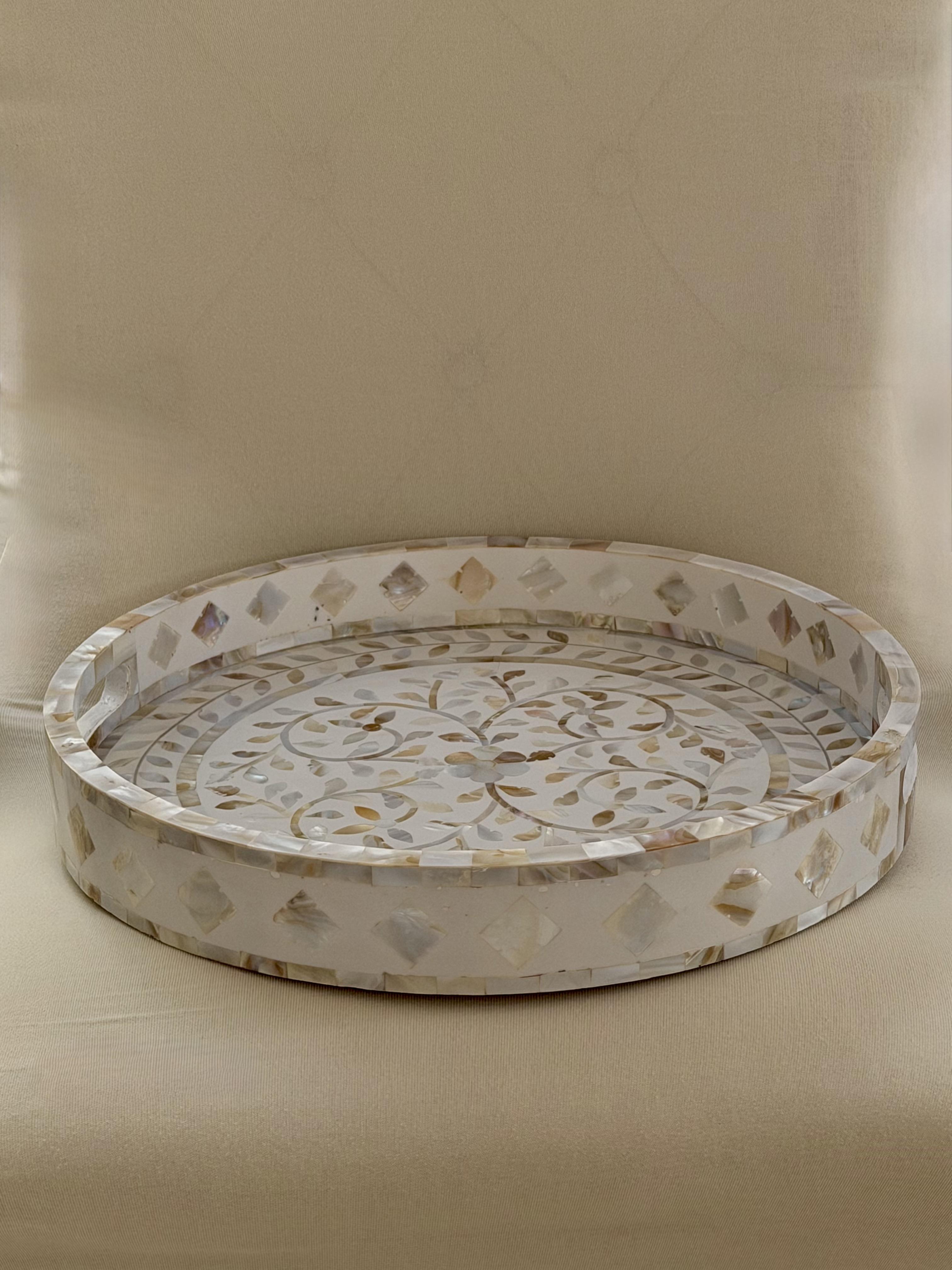 A piece of functional art . Our mother of pearl Round Inlay Tray from Zahra Collection blends timeless craftsmanship with refined modernity. Handcrafted with intricate floral motifs in natural mother of pearl, it reflects delicate light and subtle beauty from every angle. Perfect for serving, styling, or display, it transforms everyday gatherings into graceful moments. Material: Natural mother of pearl and wood.