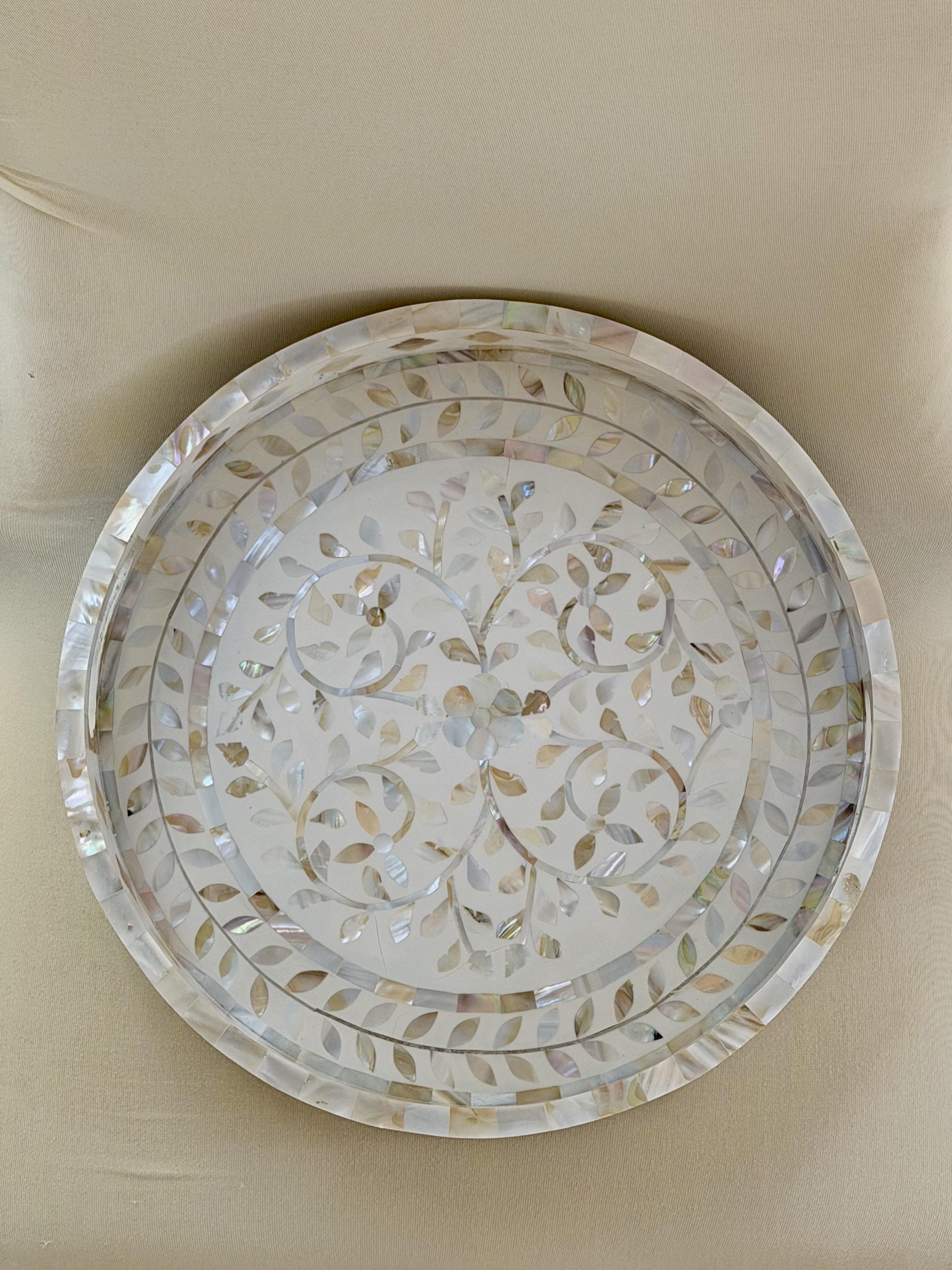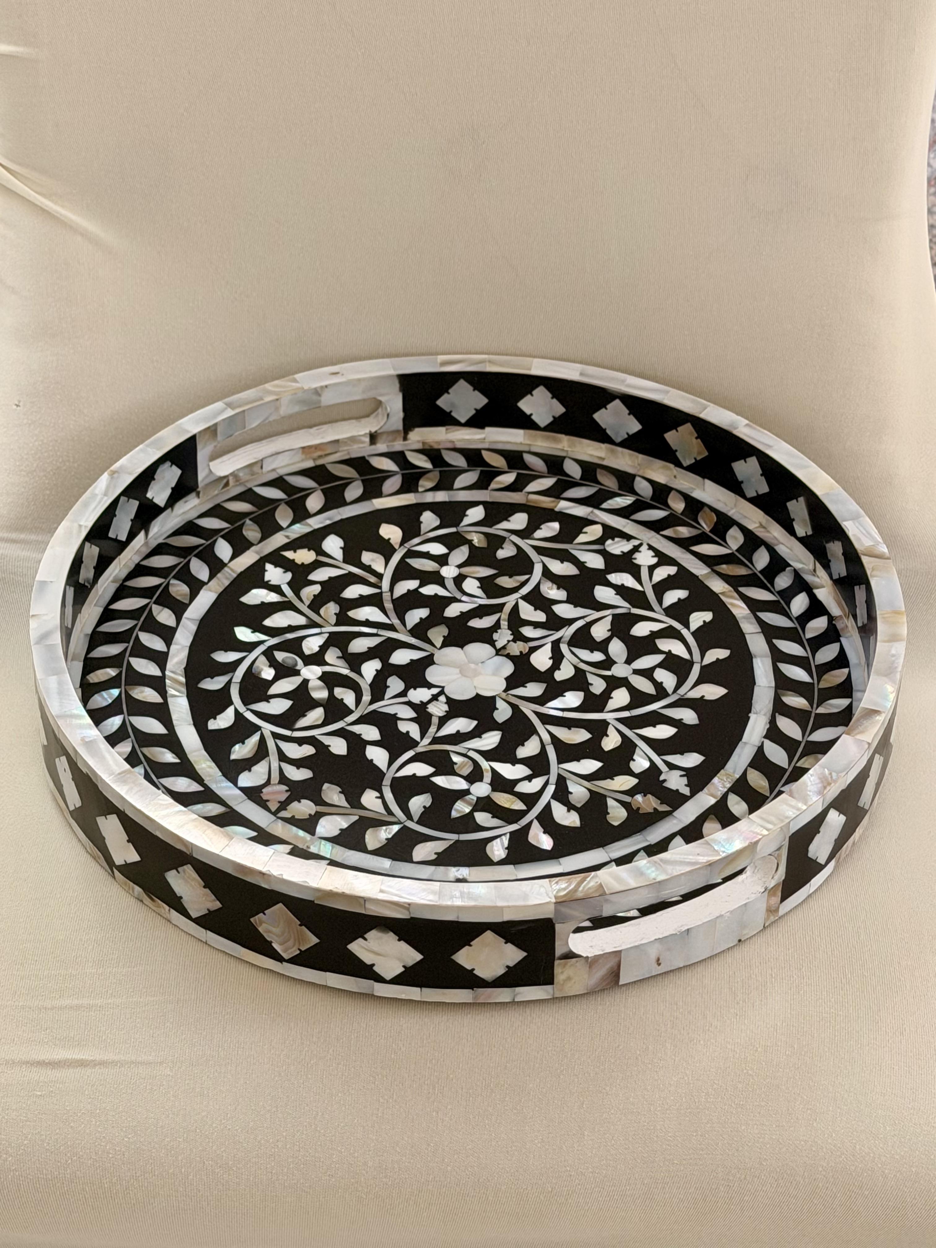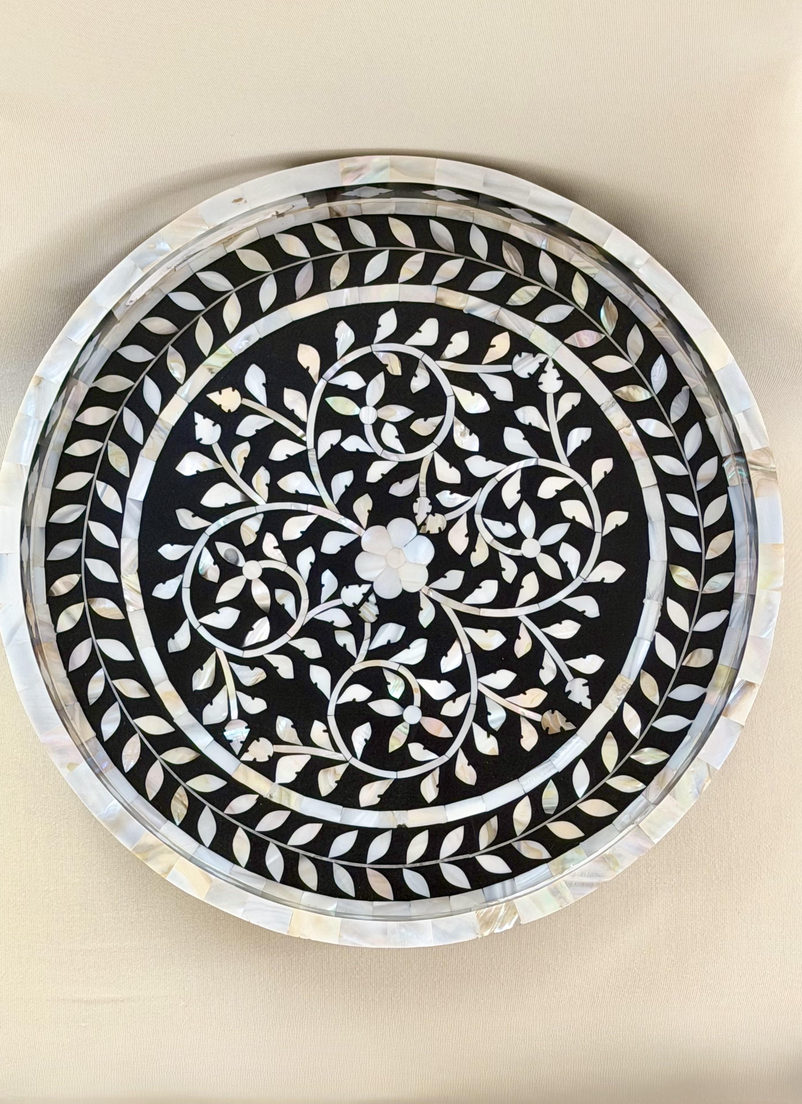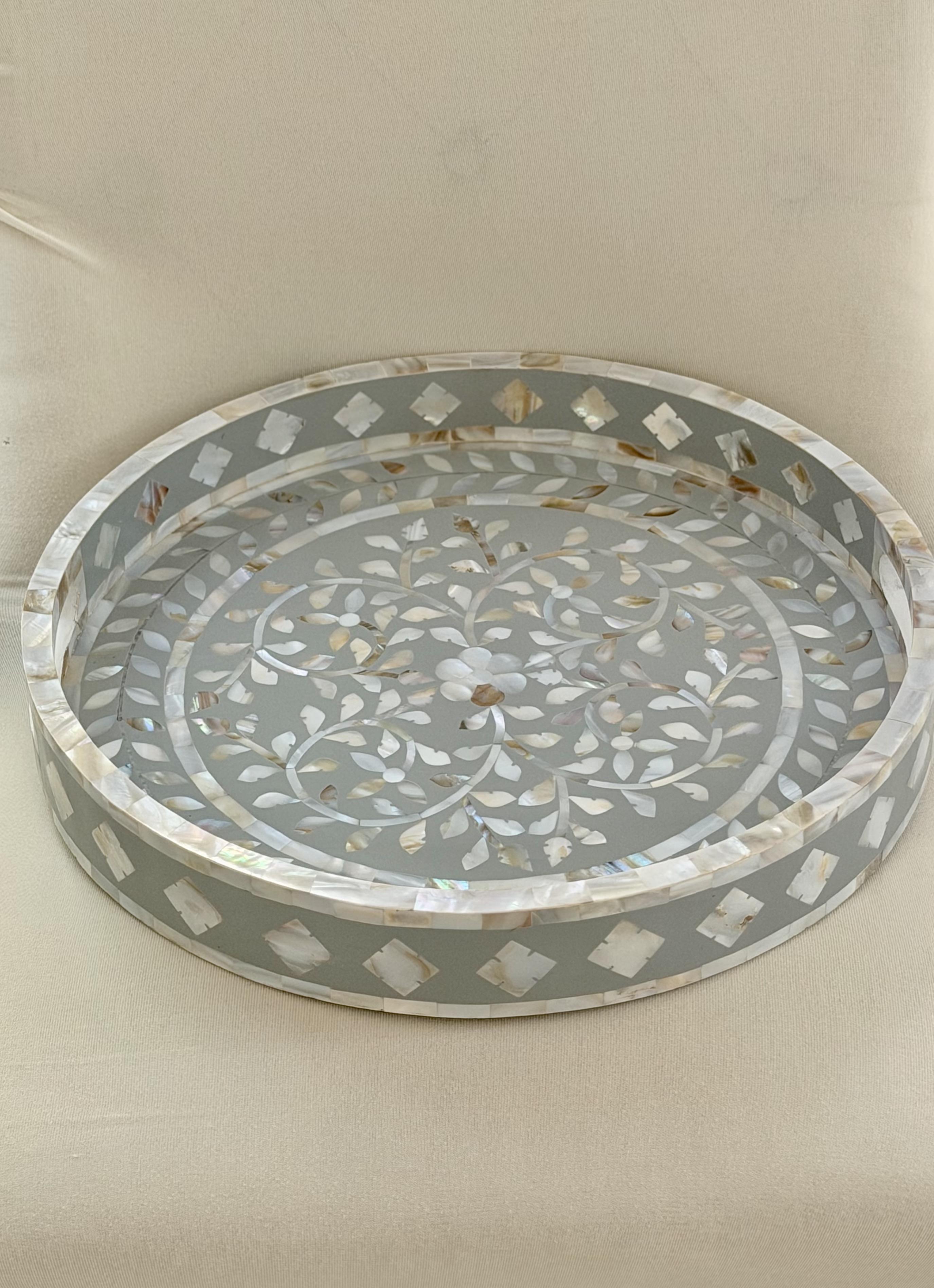 A piece of functional art . Our mother of pearl Round Inlay Tray from Zahra Collection blends timeless craftsmanship with refined modernity. Handcrafted with intricate floral motifs in natural mother of pearl, it reflects delicate light and subtle beauty from every angle. Perfect for serving, styling, or display, it transforms everyday gatherings into graceful moments. Material: Natural mother of pearl and wood.
