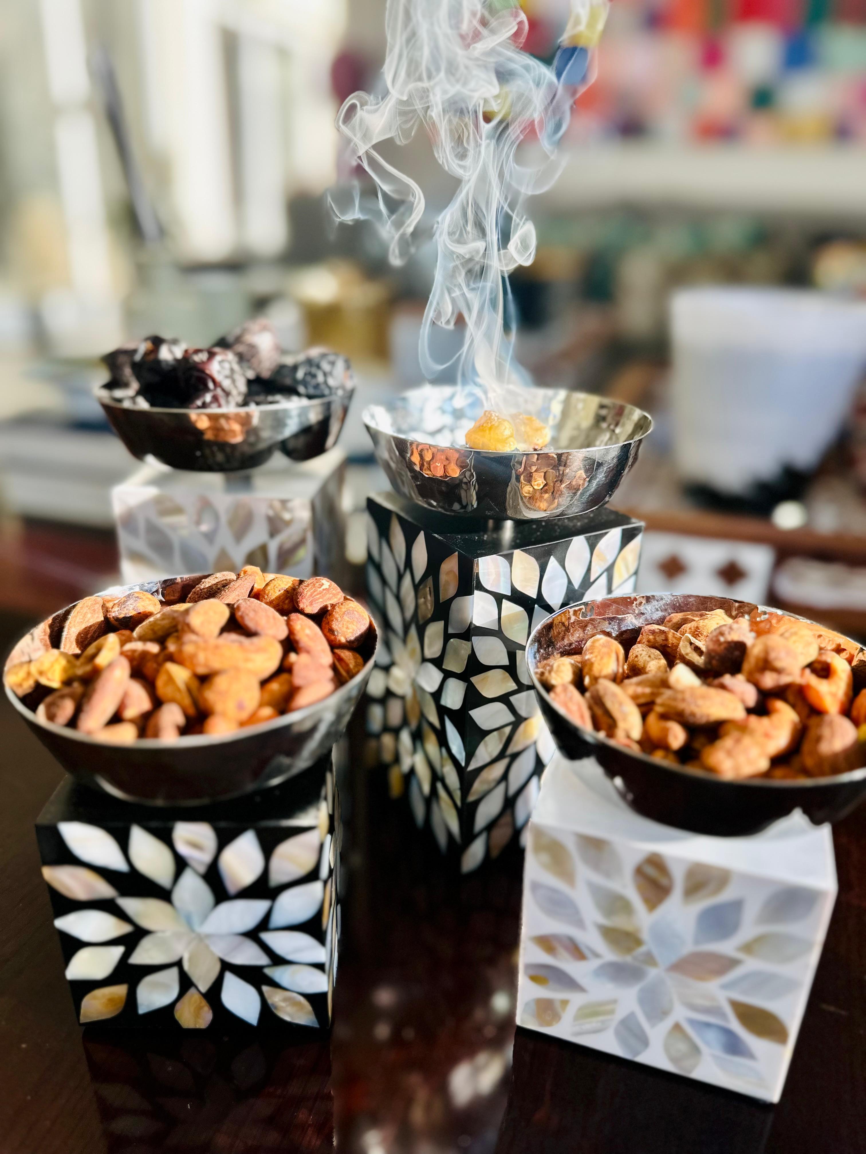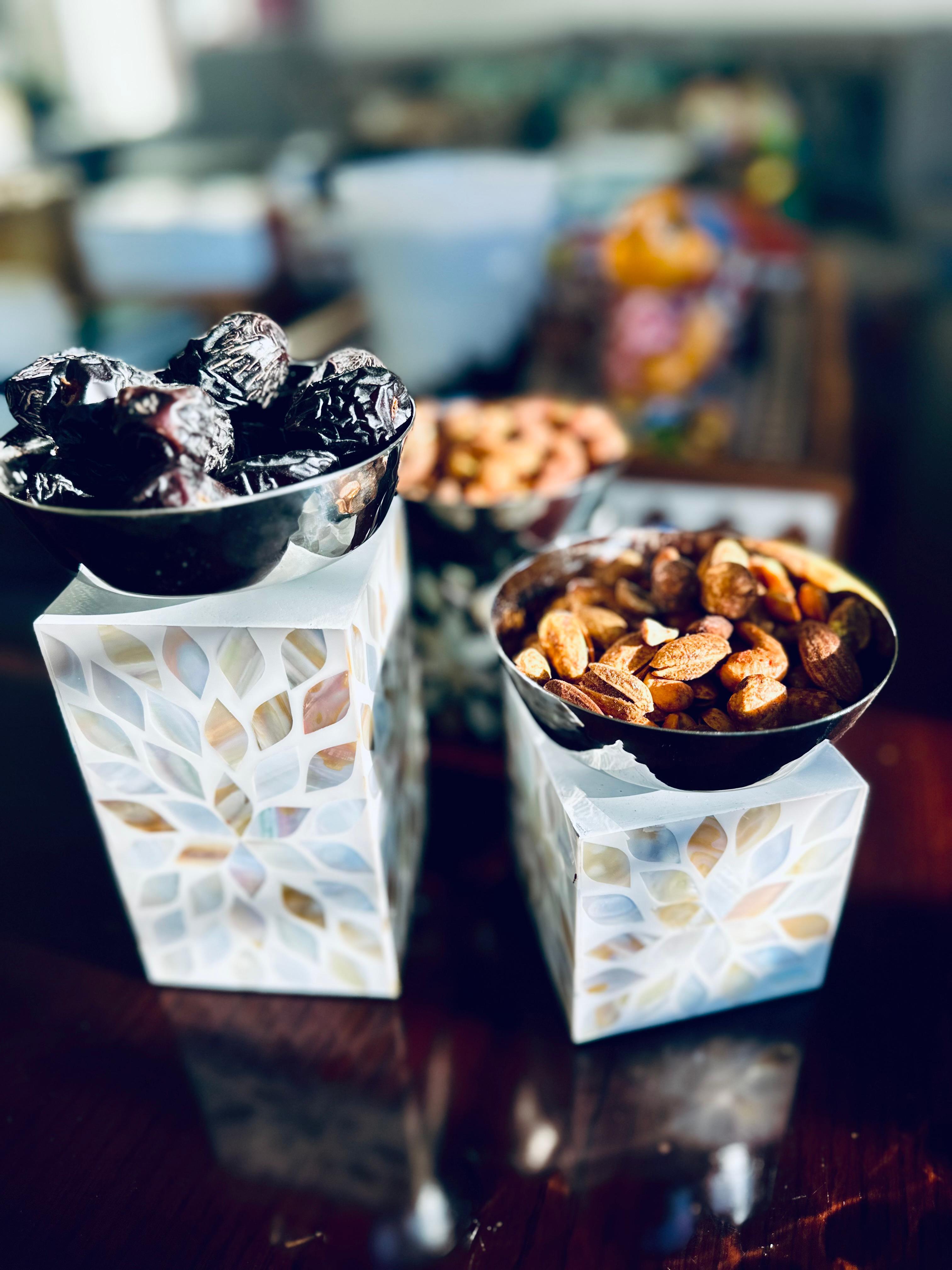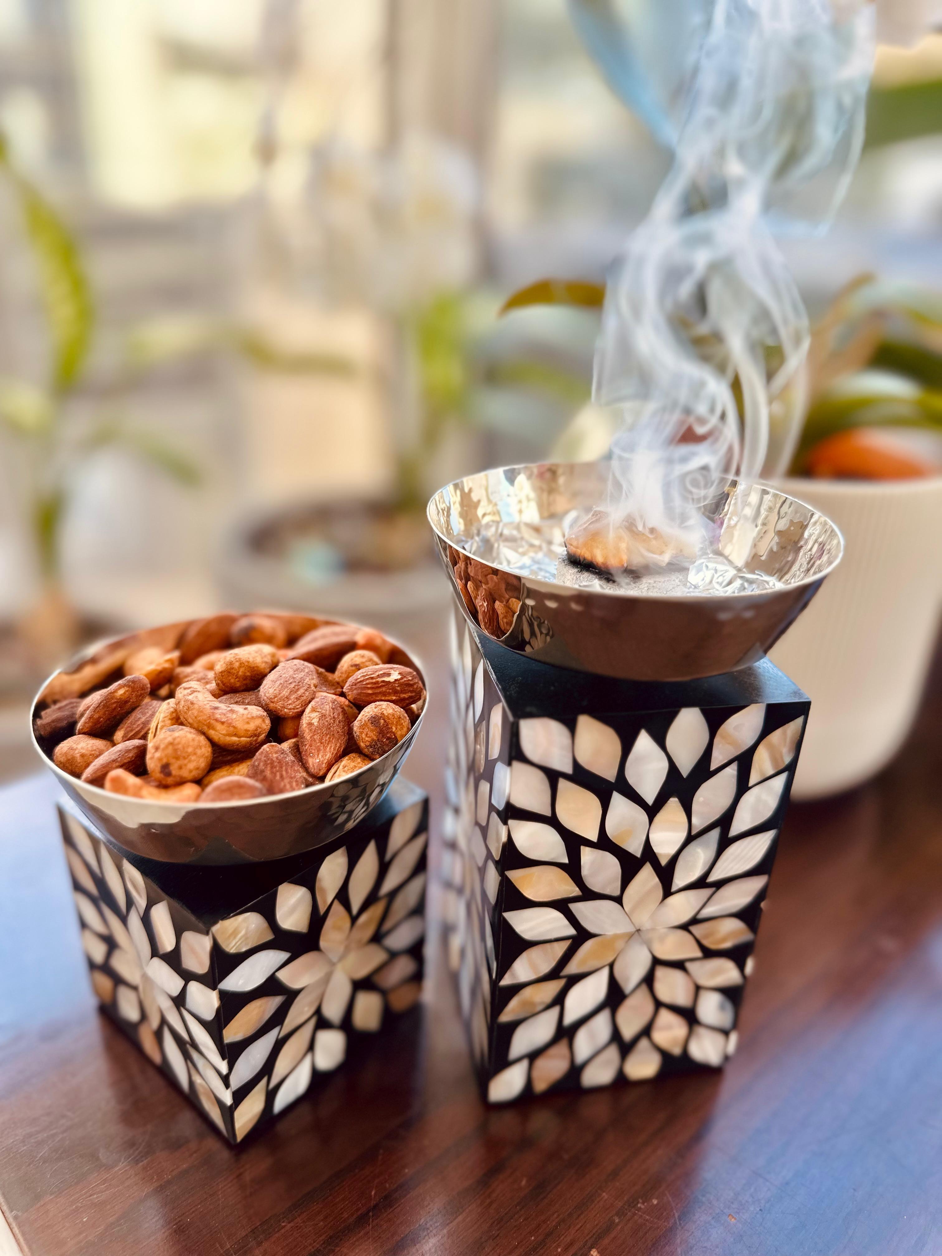 Introducing our enchanting Mother of Pearl Petal Design Set, a delightful duo featuring two stands of varying heights. This versatile set is perfect for serving a variety of treats like dates, chips, and snacks, or even for use as a unique burner. Its elegant design makes it a practical and stylish addition to any setting, making it an ideal gift for your cherished ones or a must-have piece for yourself.