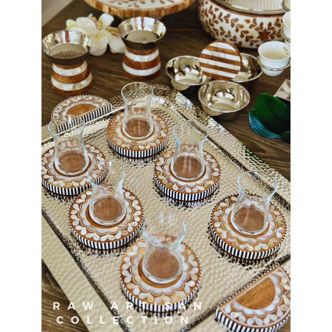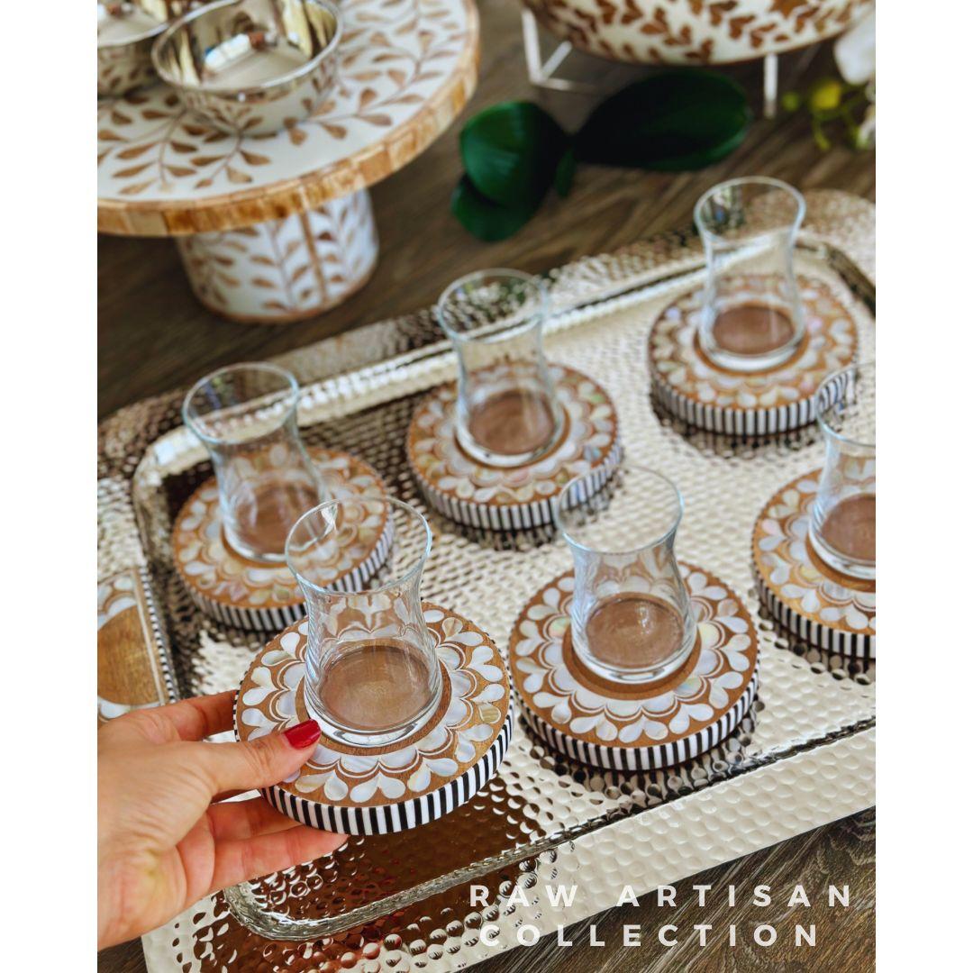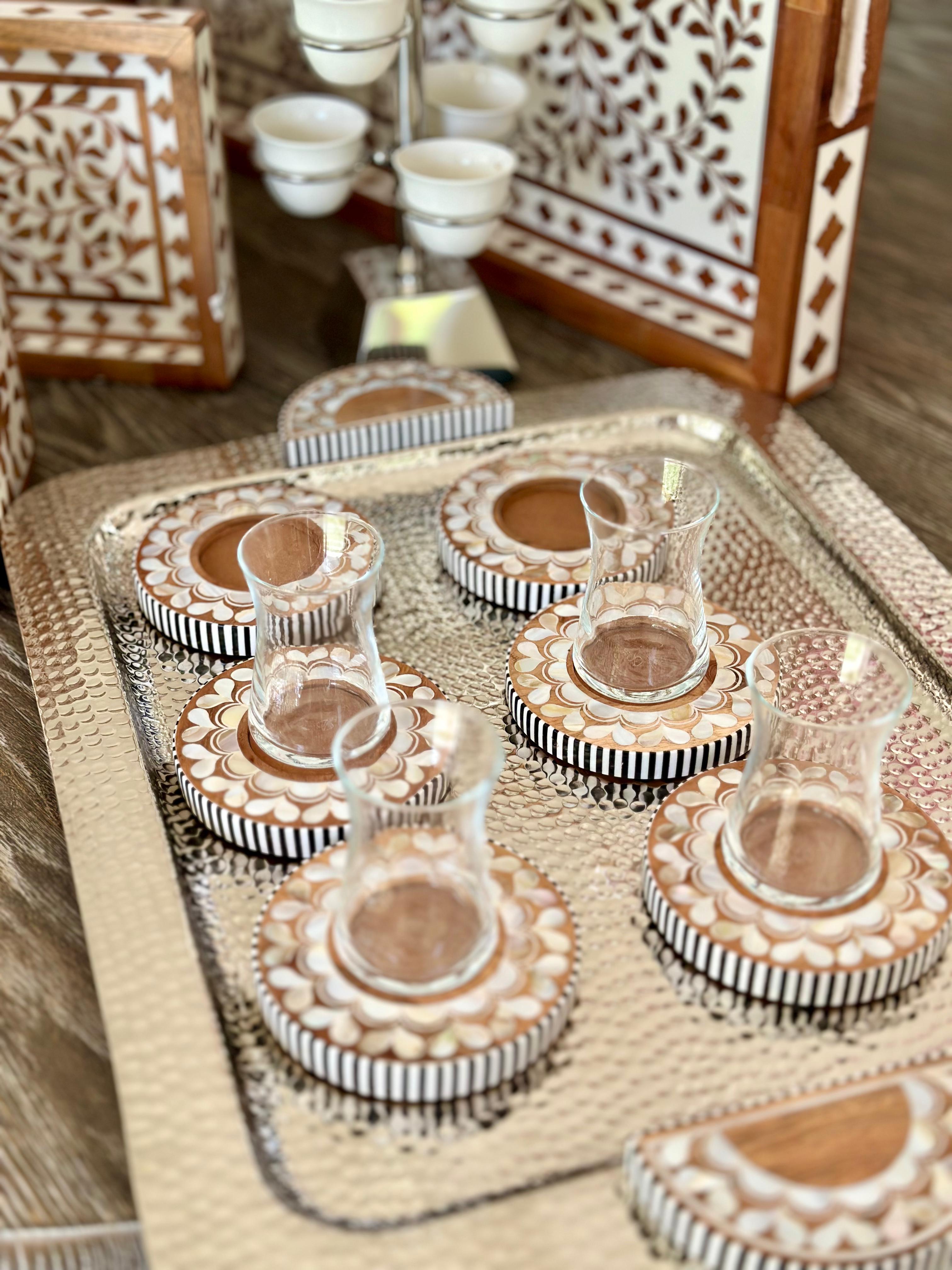 Indulge your guests and captivate their senses with our exquisite large stainless steel rectangular tray. Meticulously handcrafted by our skilled artisans, adorned with elegant wood and mother of pearl handles that perfectly complement the delicate design of the tea glass saucers. This tray is sure to impress and elevate any occasion. Treat your guests to a touch of sophistication and pamper them with elegance.