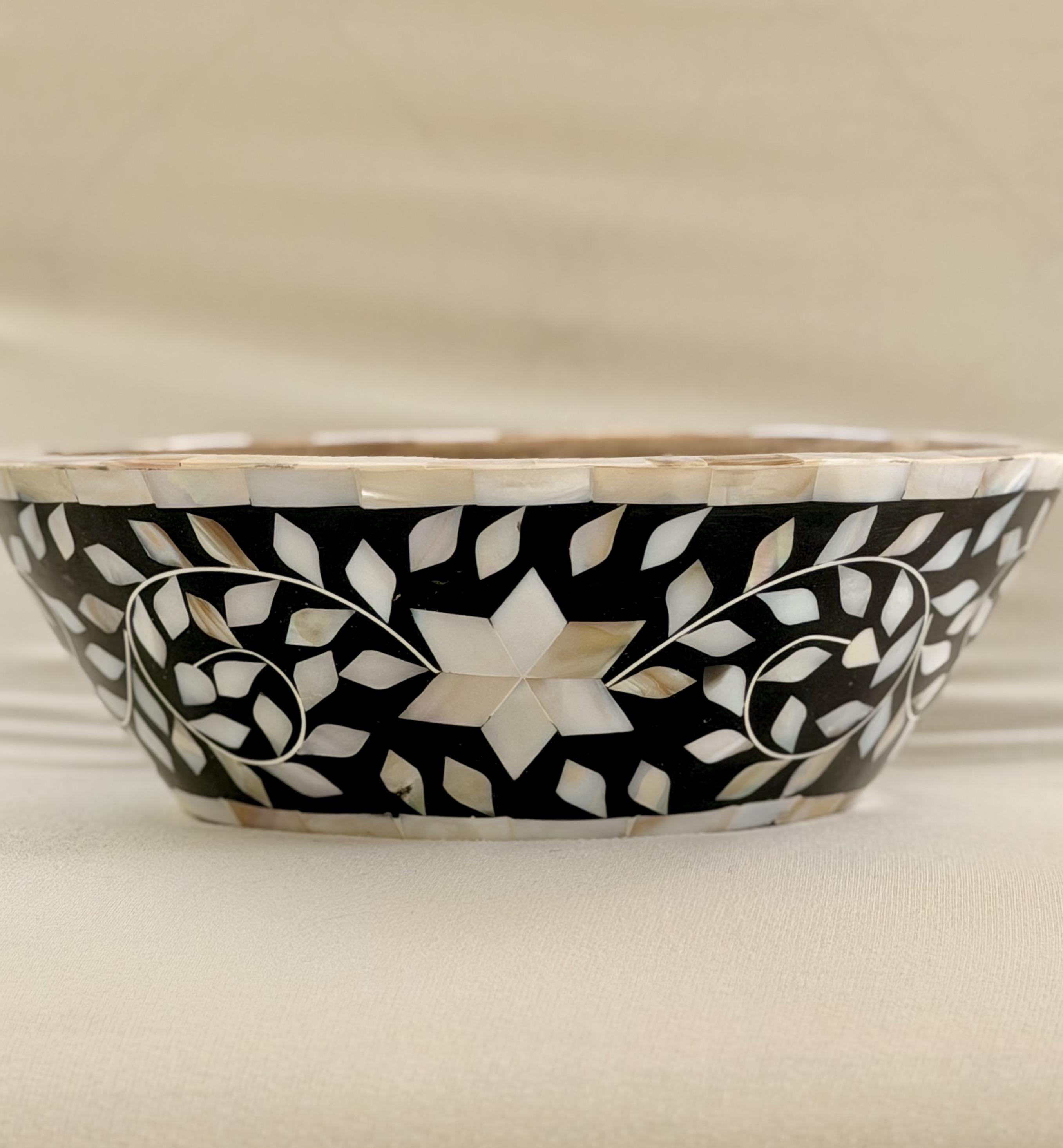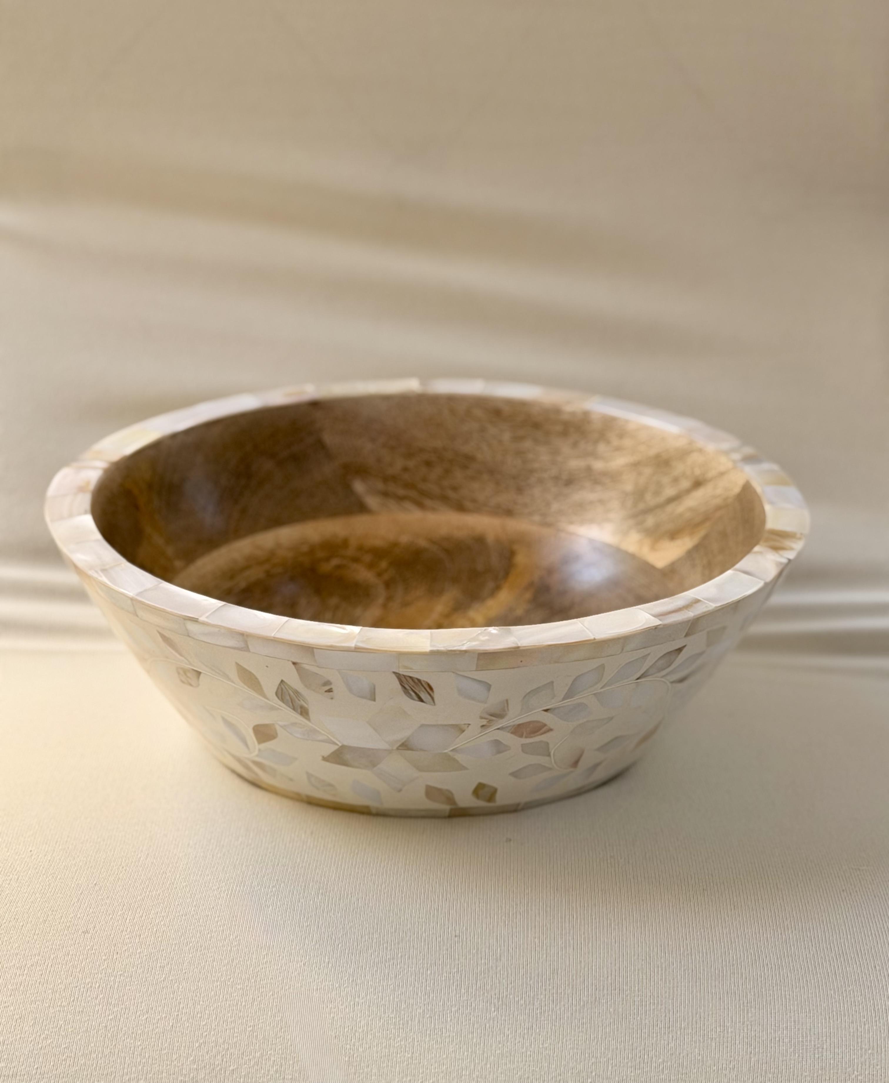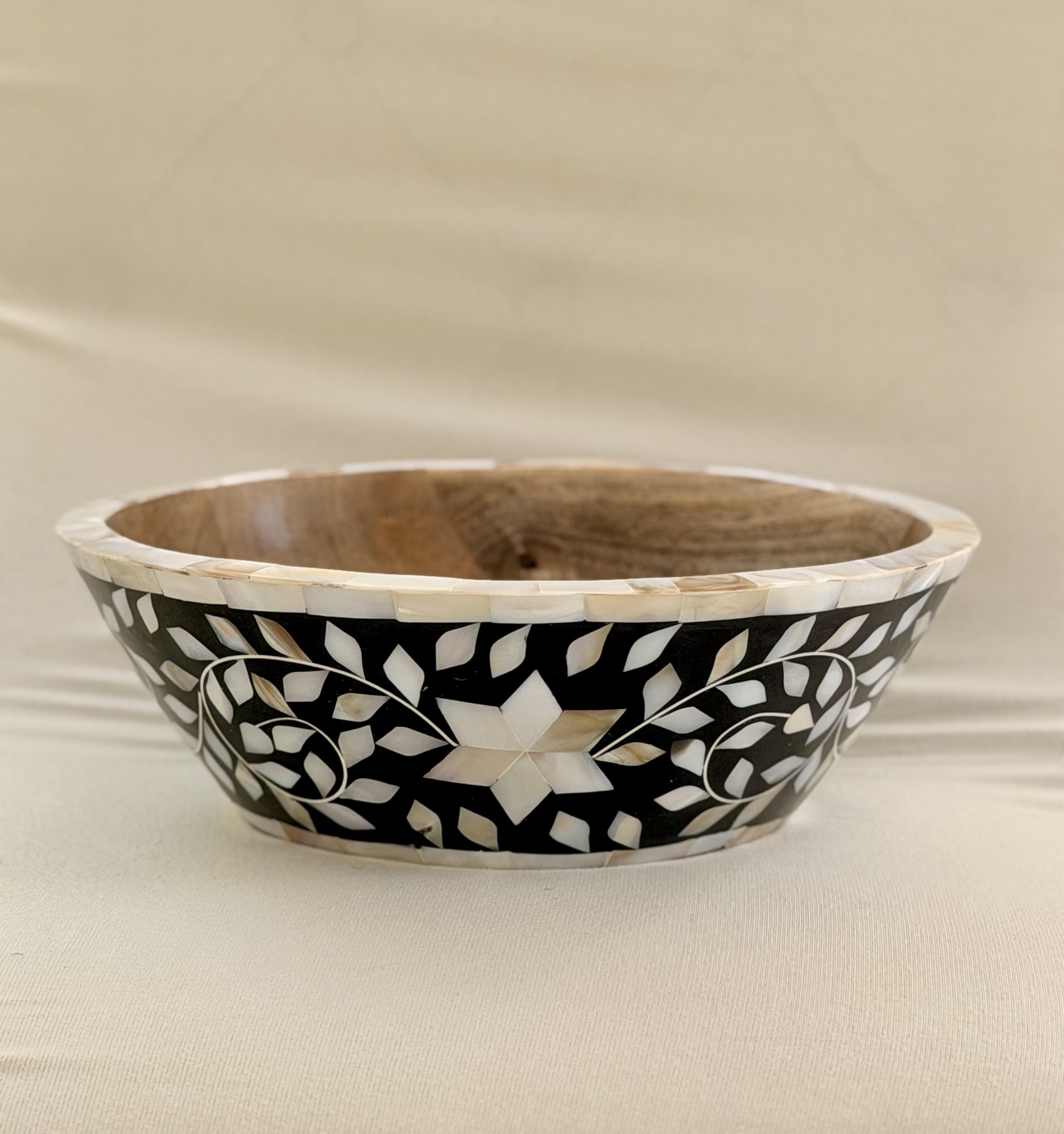 Each piece is meticulously carved from wood, then delicately inlaid with shimmering mother of pearl in intricate geometric and floral patterns. The smooth interior highlights the natural grain of the wood, while the exterior reflects a soft, iridescent glow. A celebration of craftsmanship and contrast.