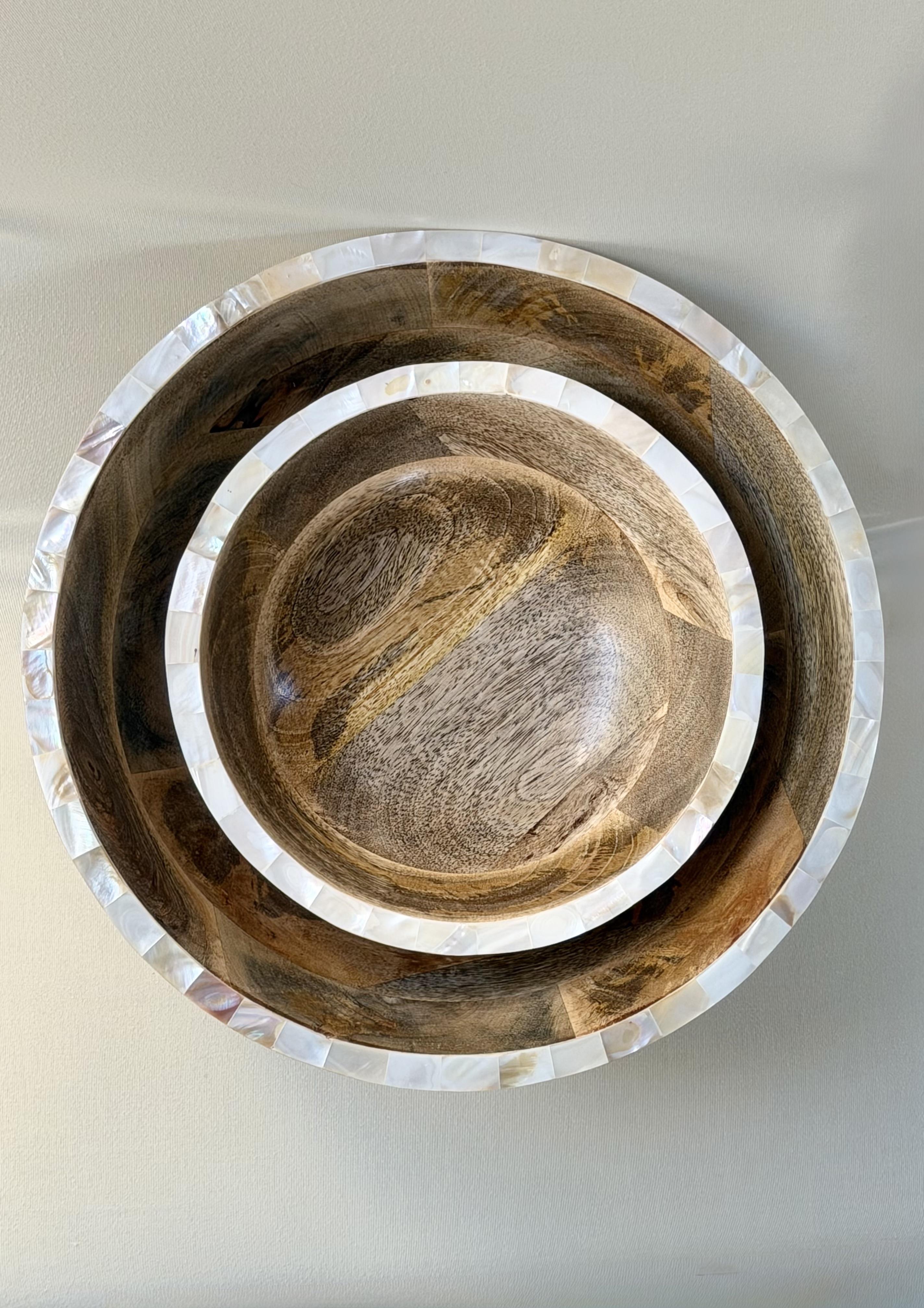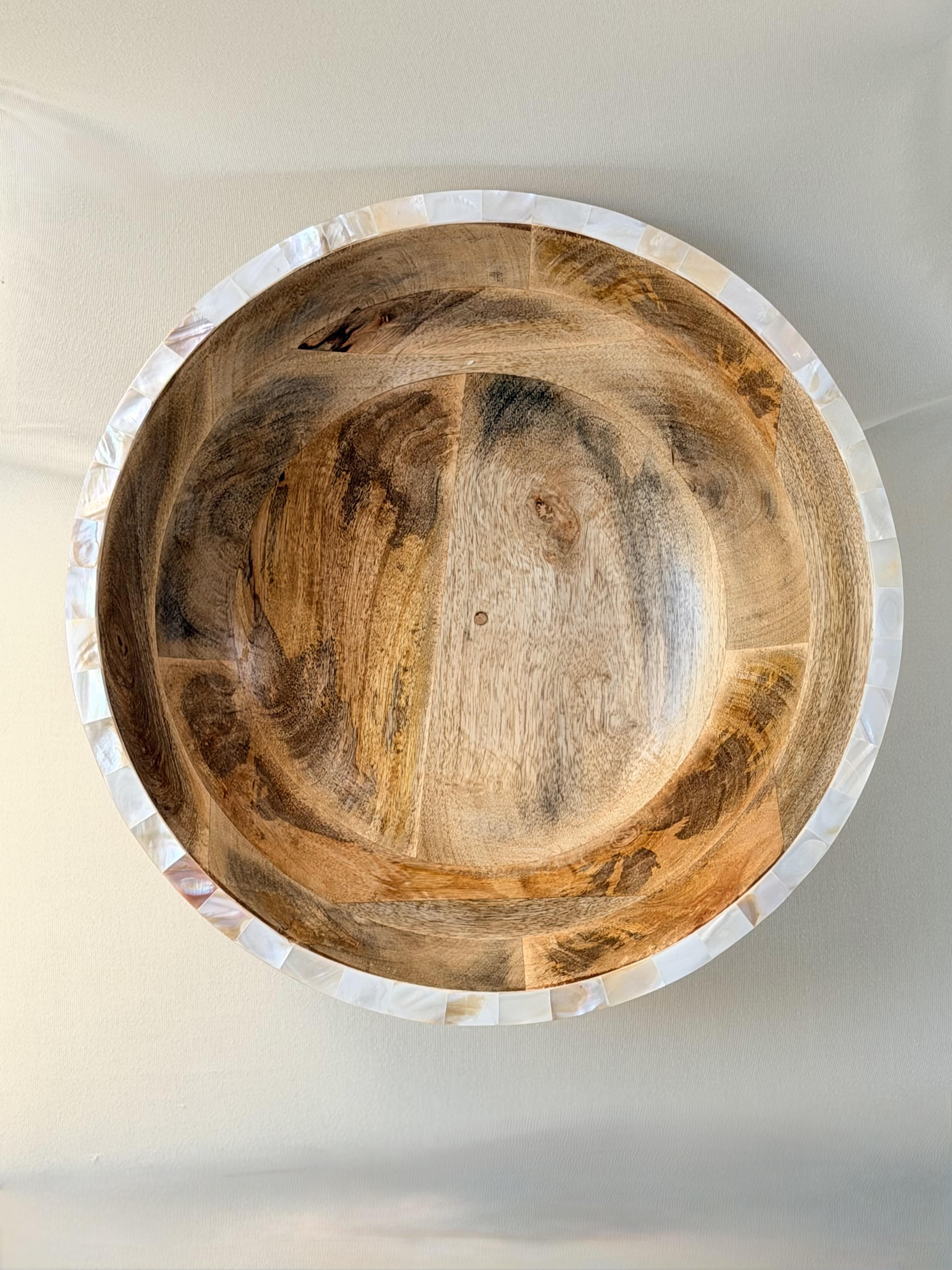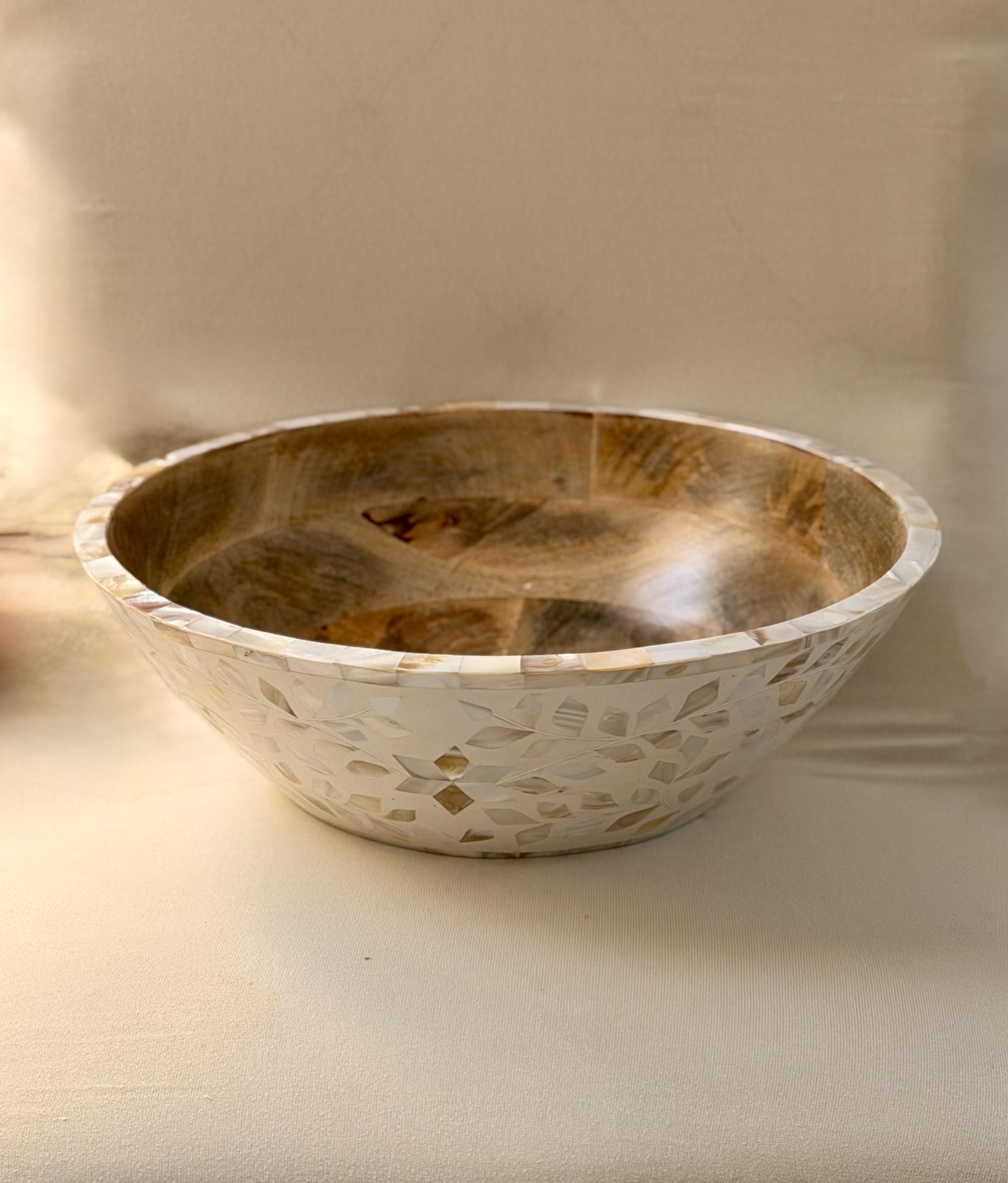 A timeless fusion of natural wood and luminous mother of pearl, these handcrafted serving bowls embody Raw Home’s vision of functional art with a soul.
